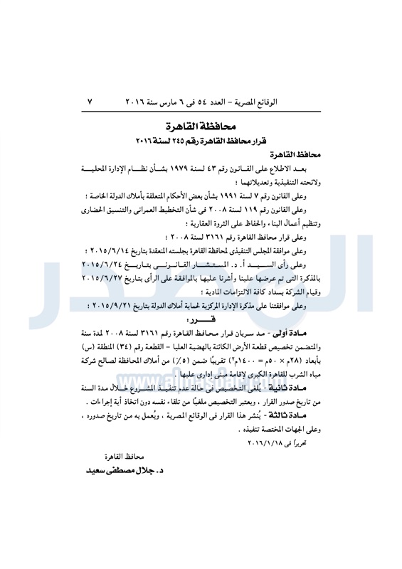 محافظات محافظة القاهرة تقرر مدّ تخصيص قطعة أرض لشركة مياه الشرب الأحد 06 مارس 2016 - 10:30 ص 3/6/2016 10:30:19 AM جلال سعيد محافظ القاهرة المصدر- خاص طباعة شارك نشرت الوقائع المصرية، في العدد رقم 54، الصادر في 6 مارس 2016، قرار محافظ القاهرة، رقم 245 لسنة 2016، بشأن تخصيص قطة الأرض الكائنة بالهضبة، لصالح شركة مياه الشرب.لقراءة القرار: طباعة شارك مياه الشرب محافظة القاهرة محافظ القاهرة تخصيص قطعه ارض الوقائع المصرية المياه تابع المصدر علي جوجل نيوز تطبيق نبض