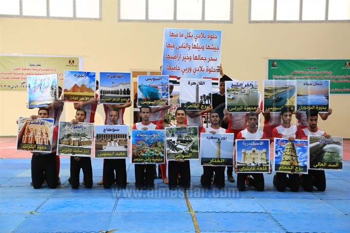 وقدم شباب الجامعات مجموعة من العروض الرياضية بصالة المنازلات المغطاة بنادي المدينة بالأقصر، قدموا خلالها لوحة فنية تعبر عن مدى حبهم وولائهم لمصر.