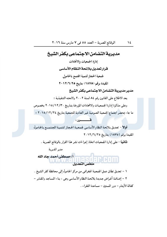 نشرت الوقائع المصرية في العدد رقم 55، الصادر في 7 مارس 2016، قرار مديرية التضامن الإجتماعى بكفر الشيخ، بشأن تعديل لائحة النظام الأساسى لجمعية الحجاز لتنمية المجتمع.