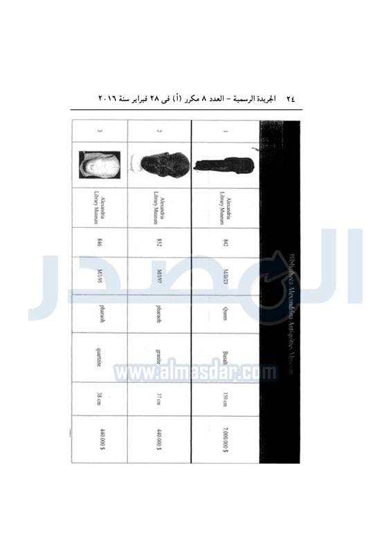 نشرت الجريدة الرسمية، في العدد رقم 8 مكرر (أ)، الصادر في 28 فبراير 2016، قرار رئيس مجلس الوزراء، رقم 543 لسنة 2016، بشأن الموافقة على سفر بعض القطع الأثرية، لعرضها بمعرض "أسرار مصر الغارقة" بانجلترا .