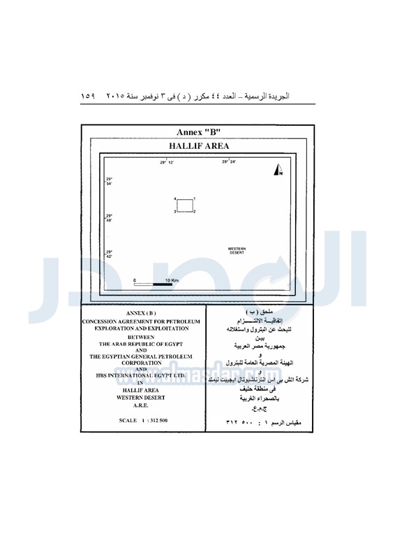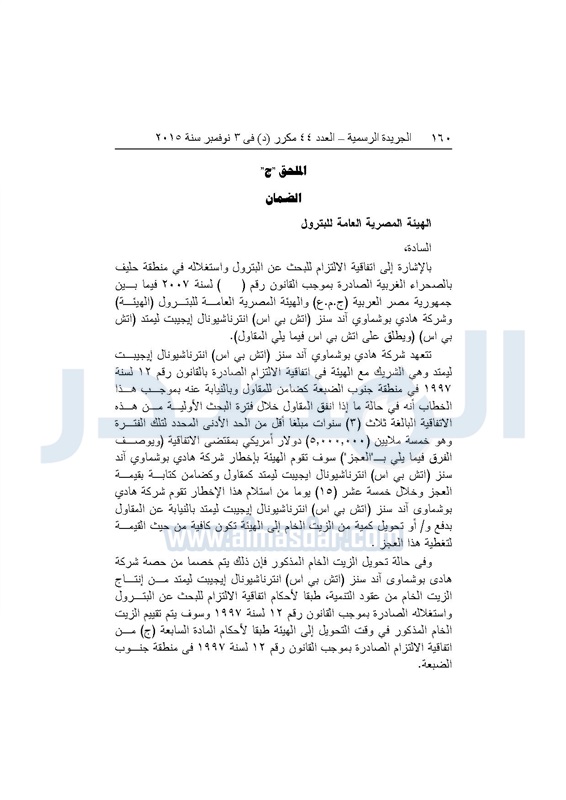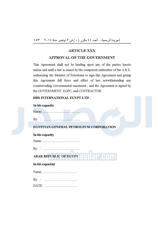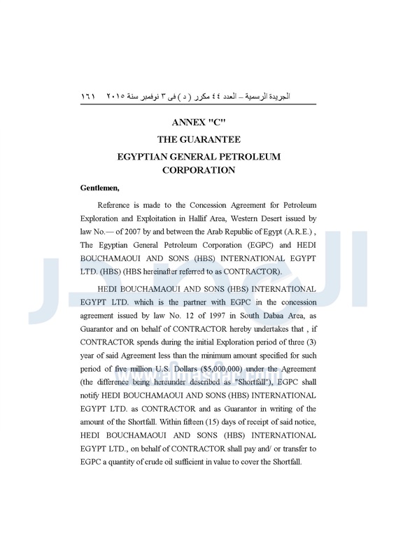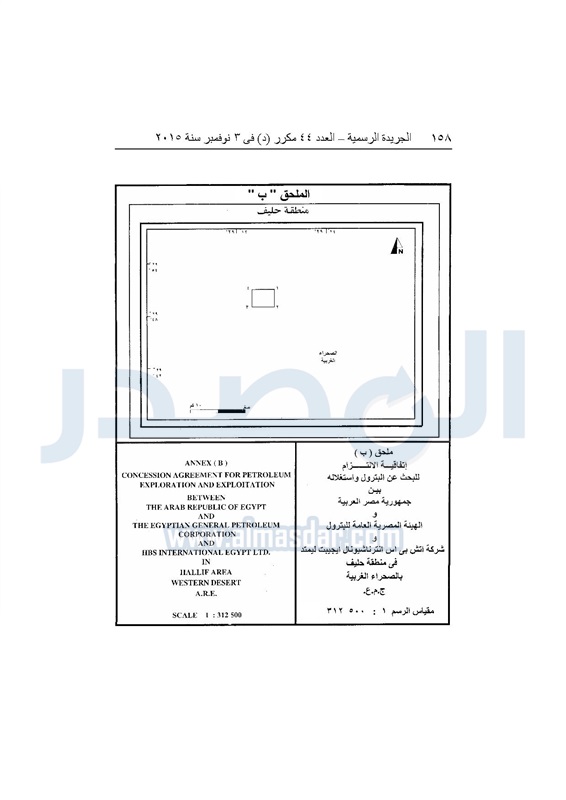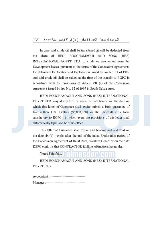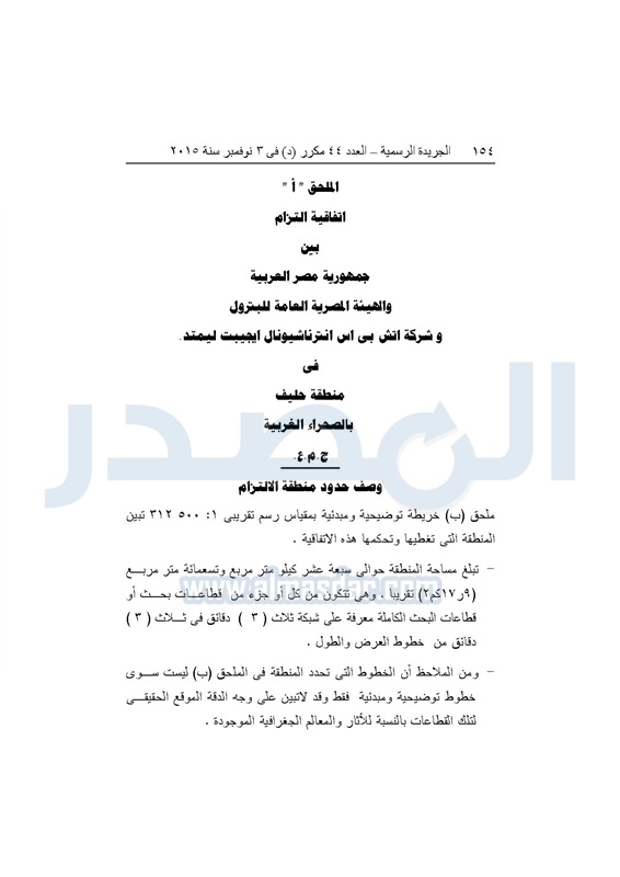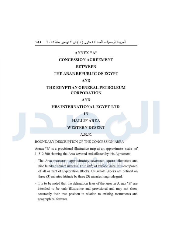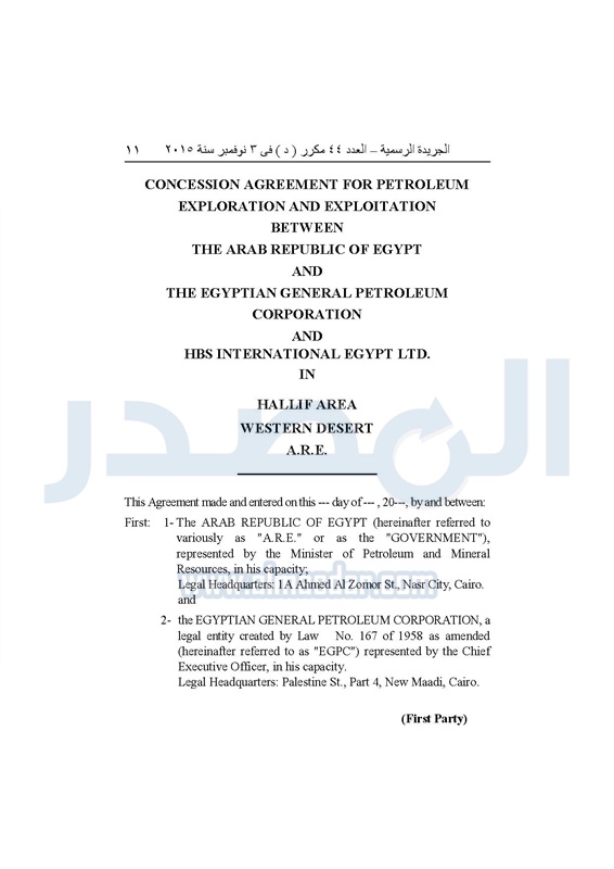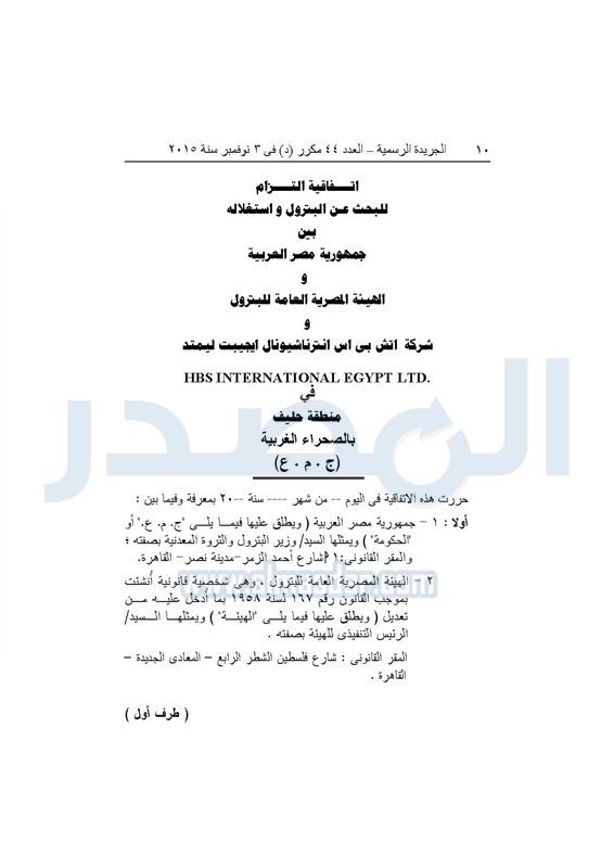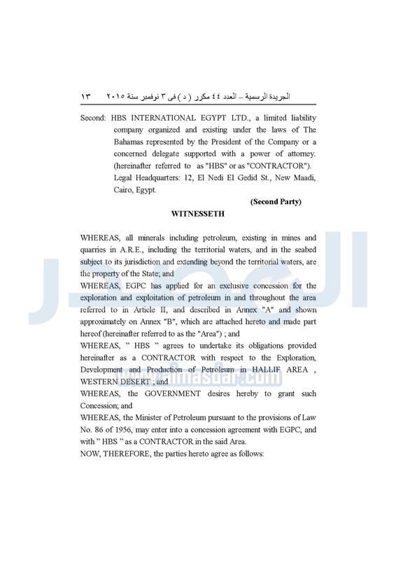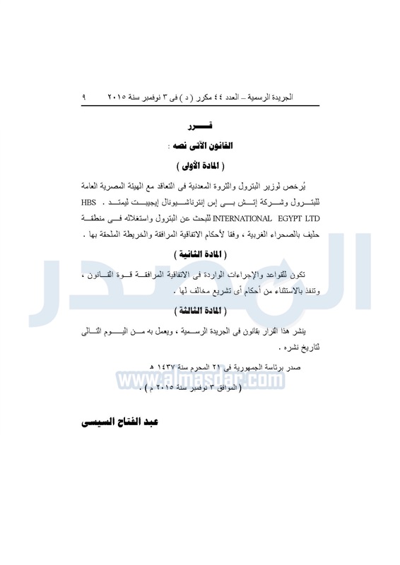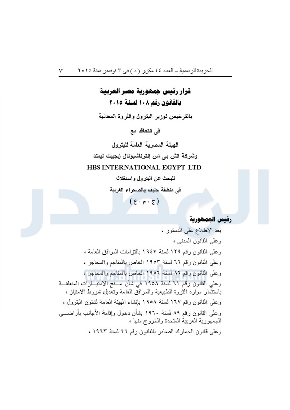 نشرت الجريدة الرسمية، في العدد رقم 44 مكرر "د"، الصادر في 3 نوفمبر 2015، قرار رئيس الجمهورية، رقم 108 لسنة 2015، بشأن الترخيص لوزير البترول في التعاقد مع الهيئة المصرية العامة للبترول، وشركة اتش بى اس إنترناشيونال إيجيبت ليمتد "HBS"، للبحث عن البترول واستغلاله في منطقة حليف، بالصحراء الغربية.