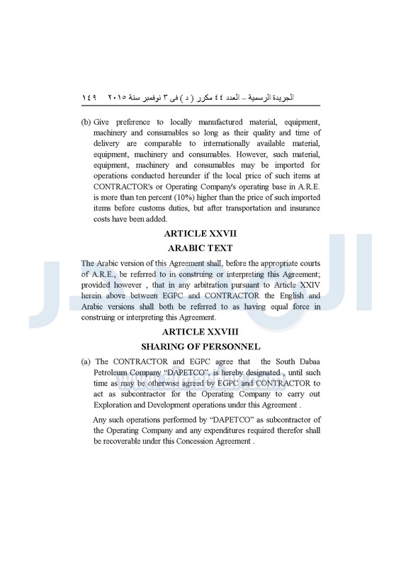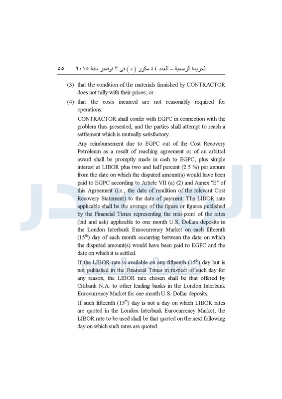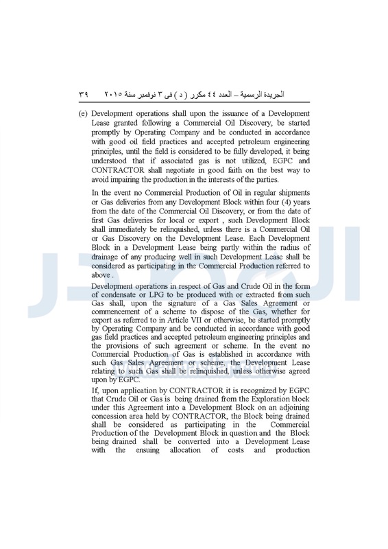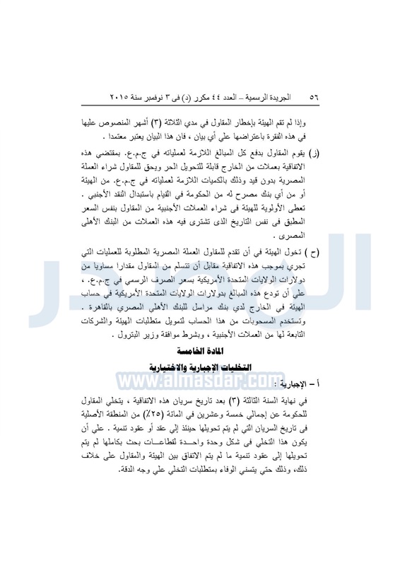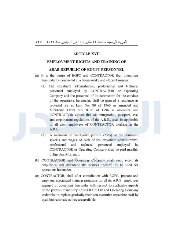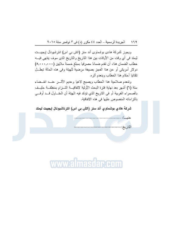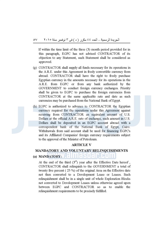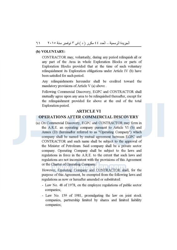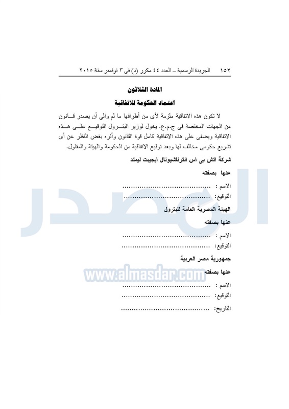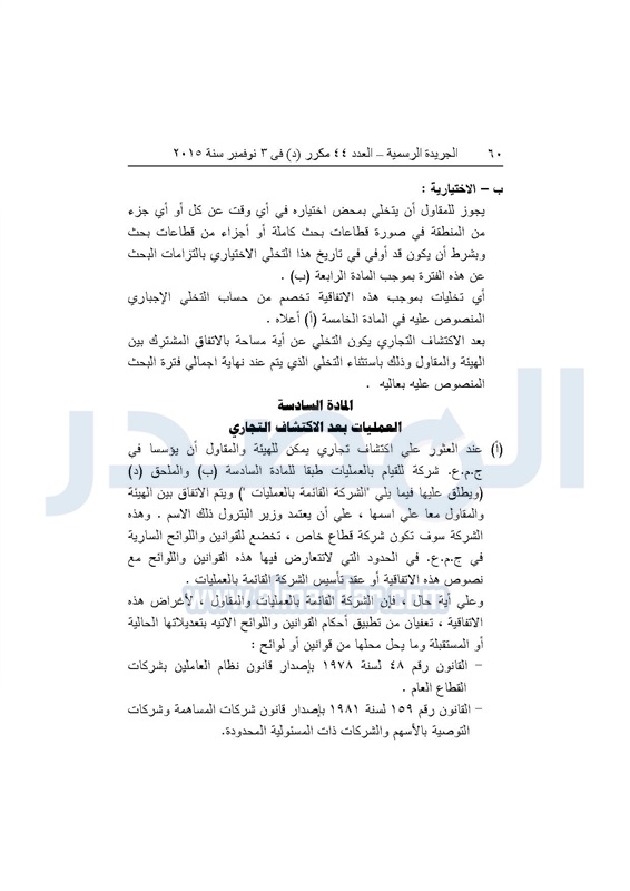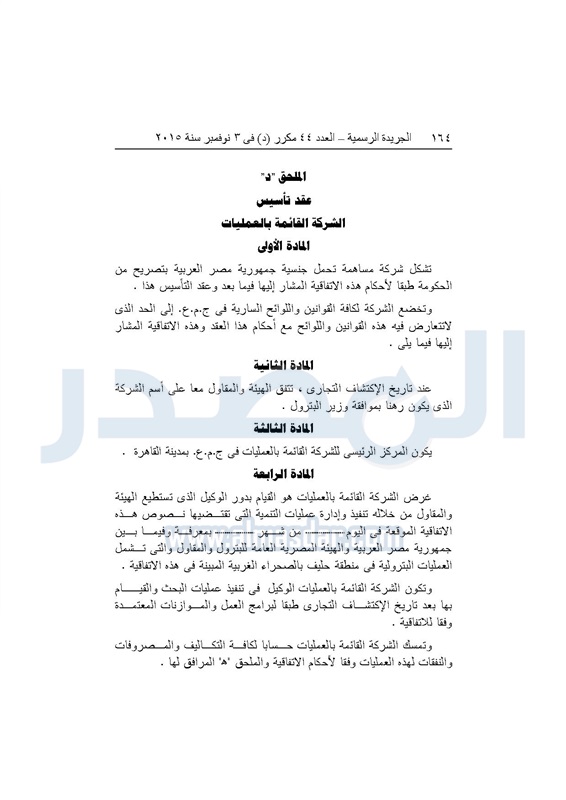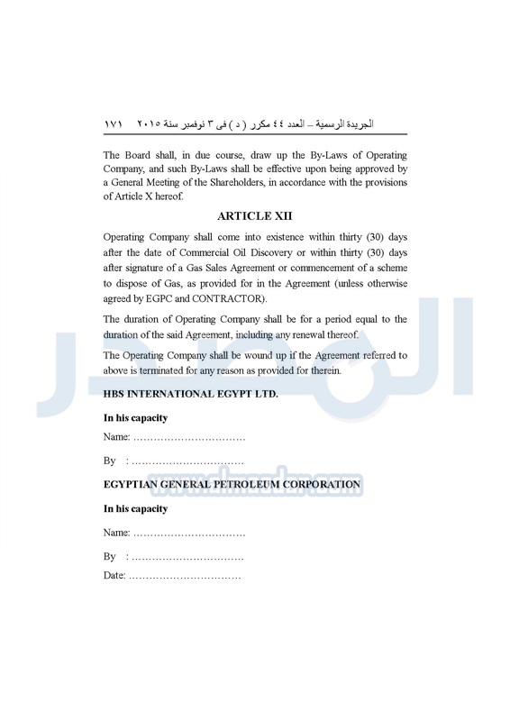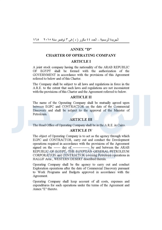 نشرت الجريدة الرسمية، في العدد رقم 44 مكرر "د"، الصادر في 3 نوفمبر 2015، قرار رئيس الجمهورية، رقم 108 لسنة 2015، بشأن الترخيص لوزير البترول في التعاقد مع الهيئة المصرية العامة للبترول، وشركة اتش بى اس إنترناشيونال إيجيبت ليمتد "HBS"، للبحث عن البترول واستغلاله في منطقة حليف، بالصحراء الغربية.