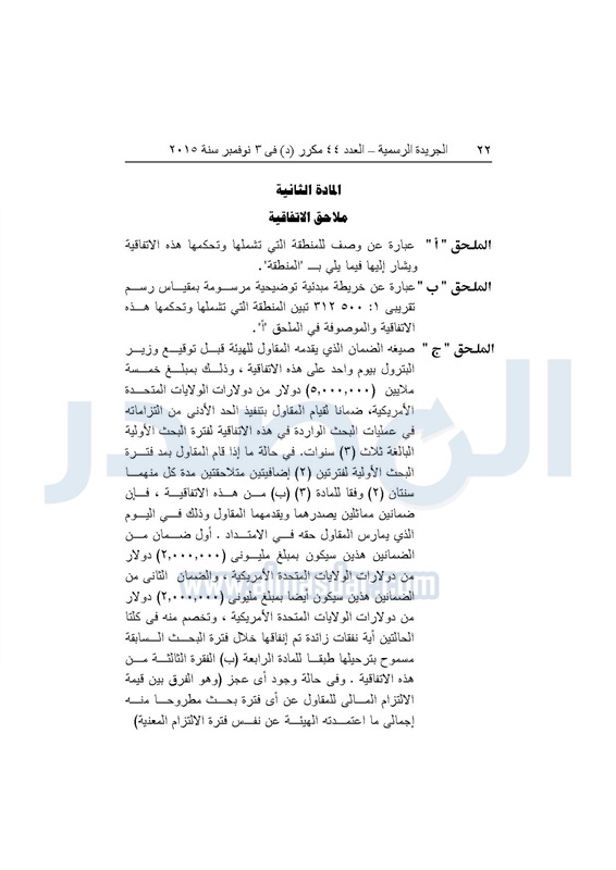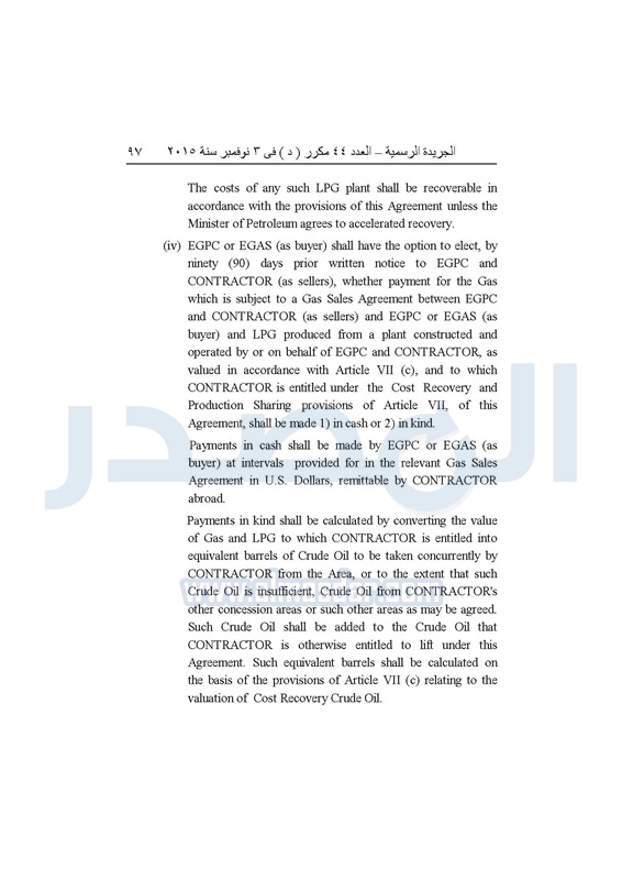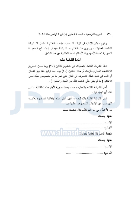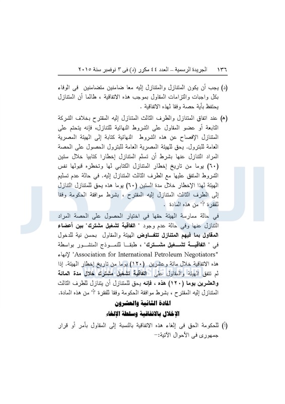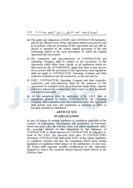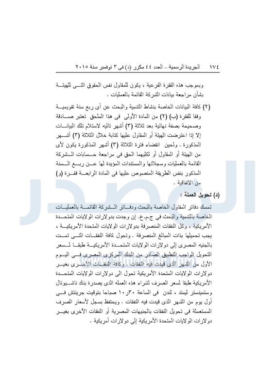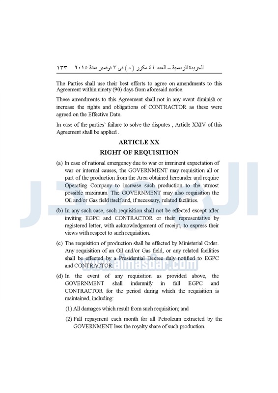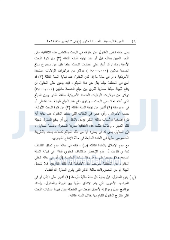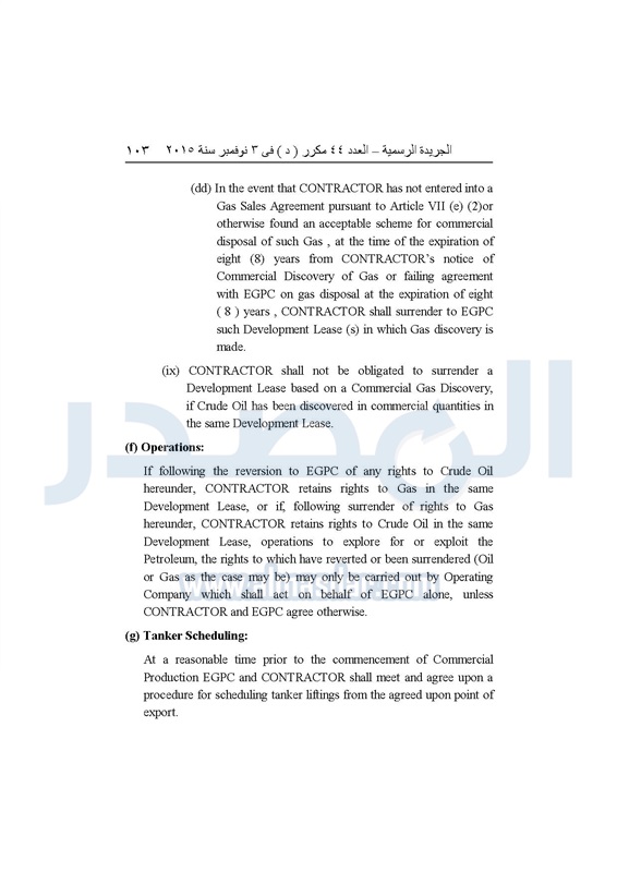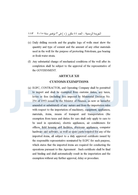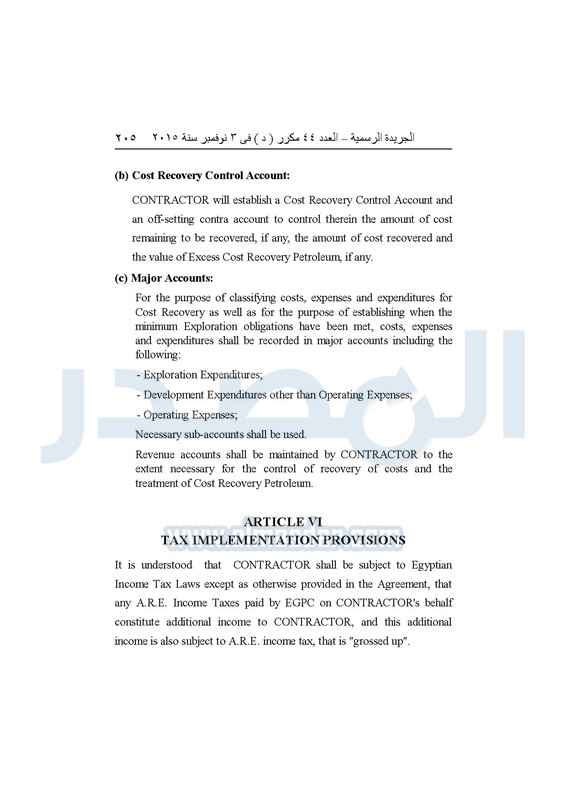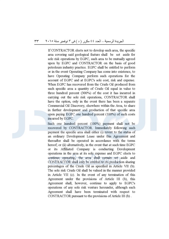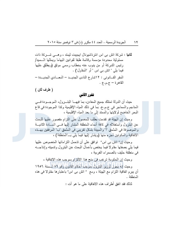 نشرت الجريدة الرسمية، في العدد رقم 44 مكرر "د"، الصادر في 3 نوفمبر 2015، قرار رئيس الجمهورية، رقم 108 لسنة 2015، بشأن الترخيص لوزير البترول في التعاقد مع الهيئة المصرية العامة للبترول، وشركة اتش بى اس إنترناشيونال إيجيبت ليمتد "HBS"، للبحث عن البترول واستغلاله في منطقة حليف، بالصحراء الغربية.