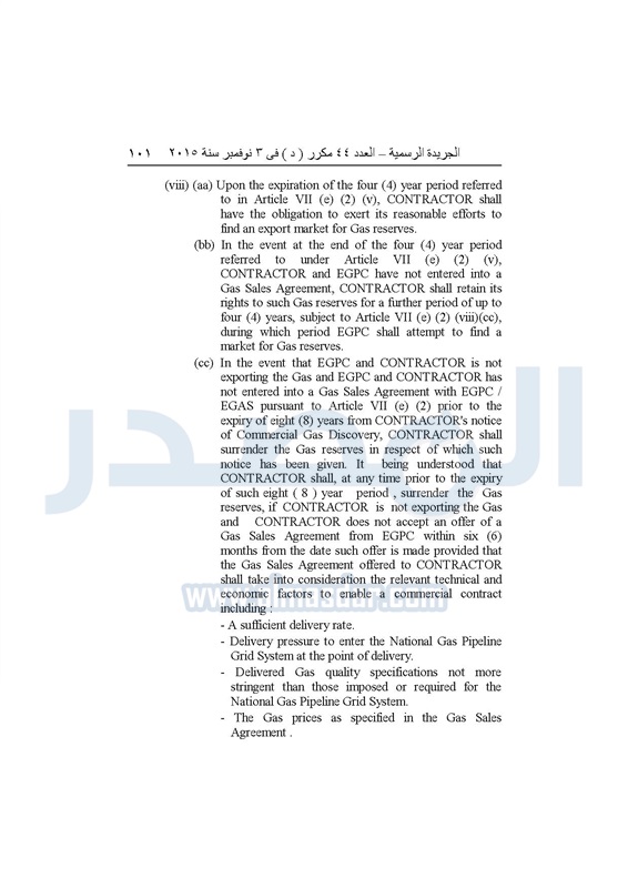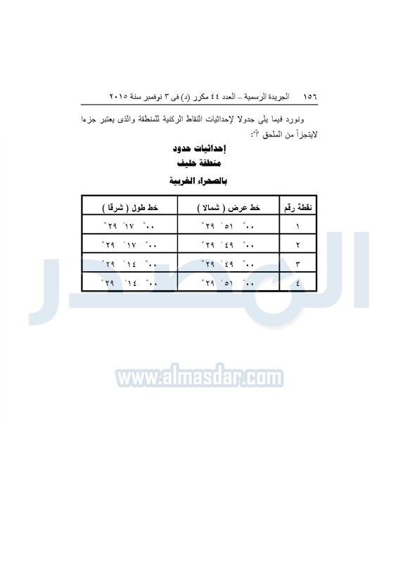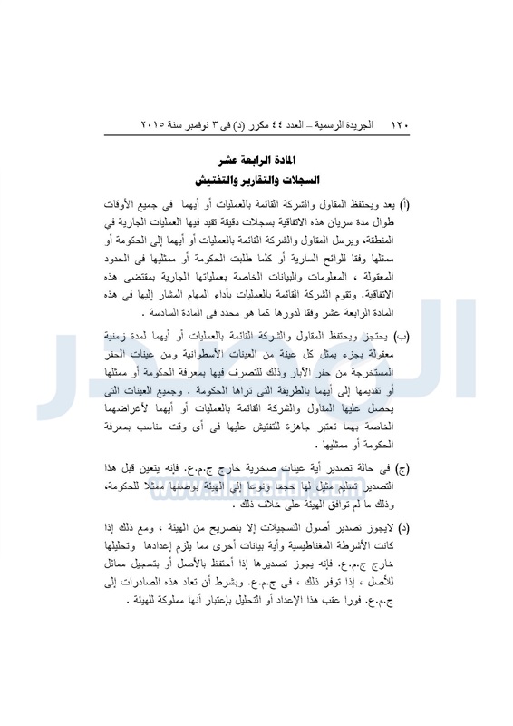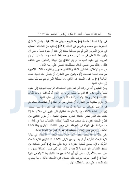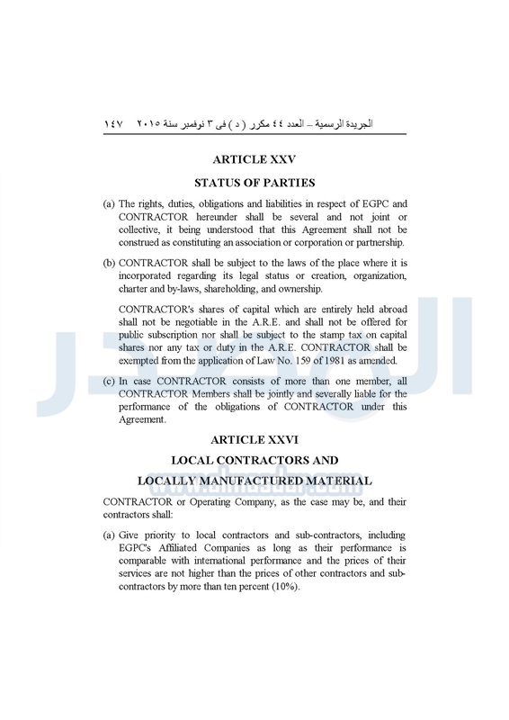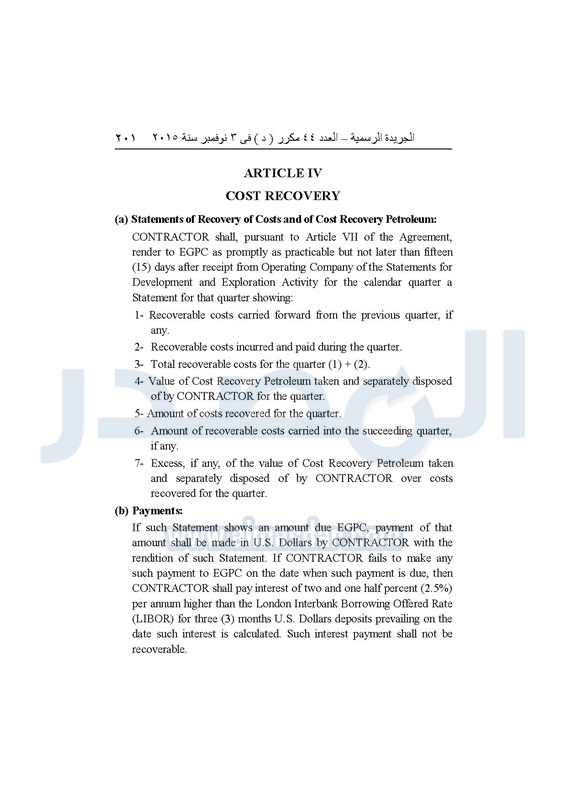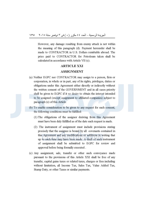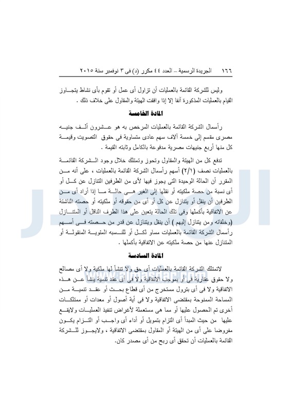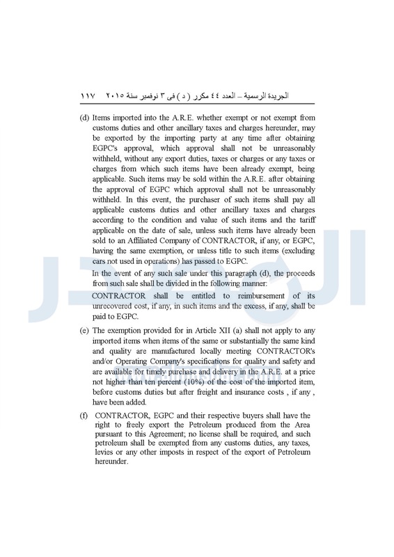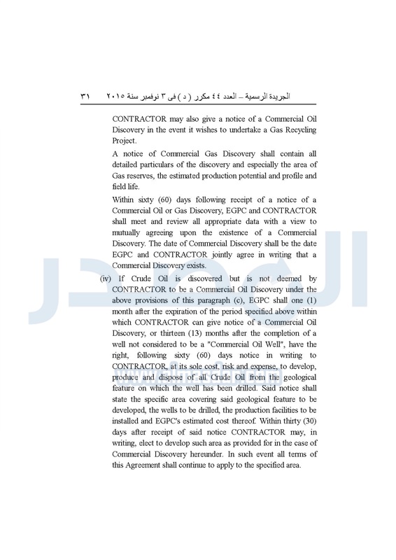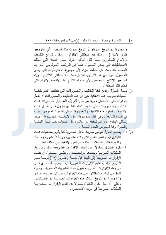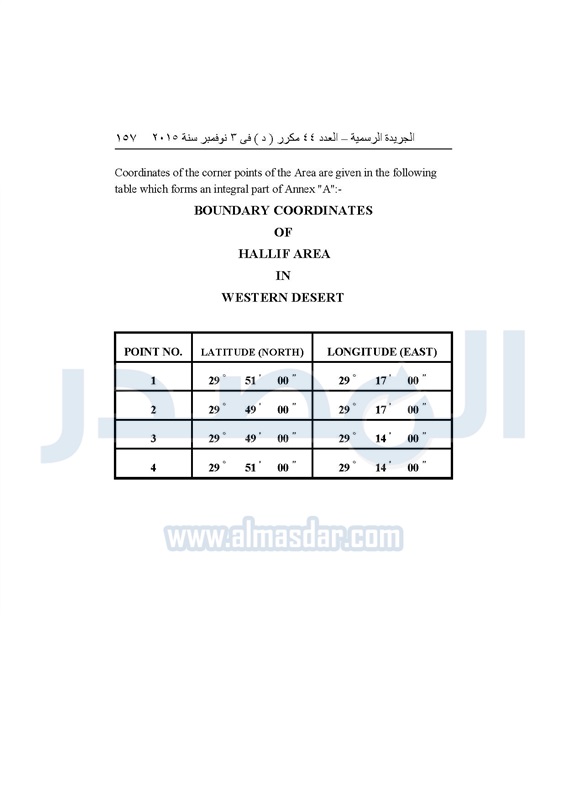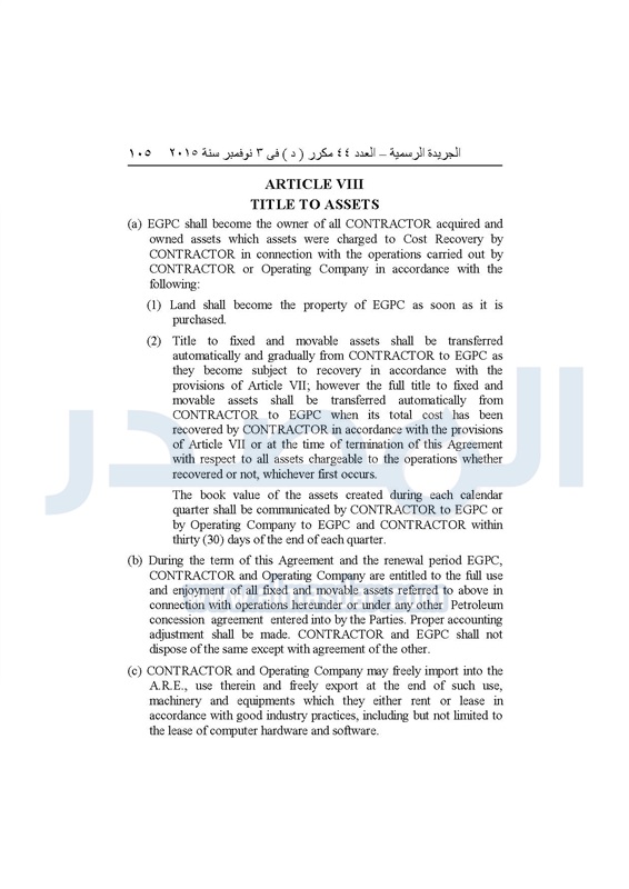 نشرت الجريدة الرسمية، في العدد رقم 44 مكرر "د"، الصادر في 3 نوفمبر 2015، قرار رئيس الجمهورية، رقم 108 لسنة 2015، بشأن الترخيص لوزير البترول في التعاقد مع الهيئة المصرية العامة للبترول، وشركة اتش بى اس إنترناشيونال إيجيبت ليمتد "HBS"، للبحث عن البترول واستغلاله في منطقة حليف، بالصحراء الغربية.