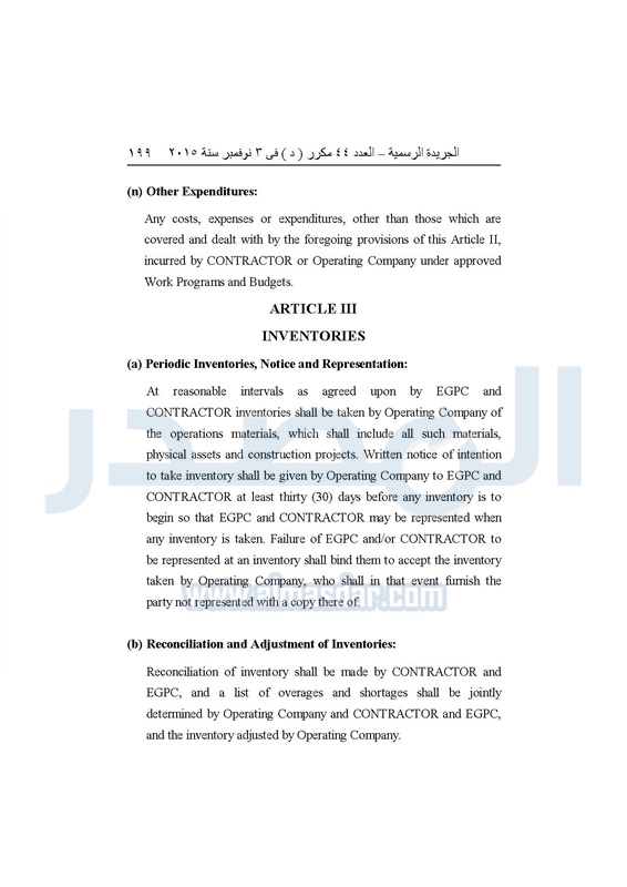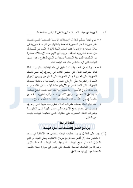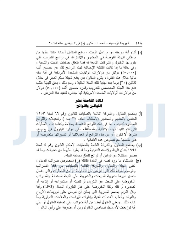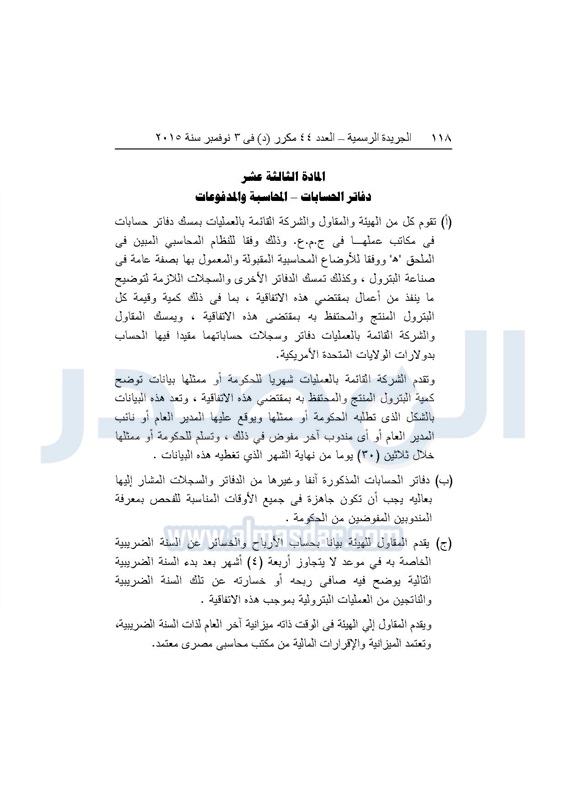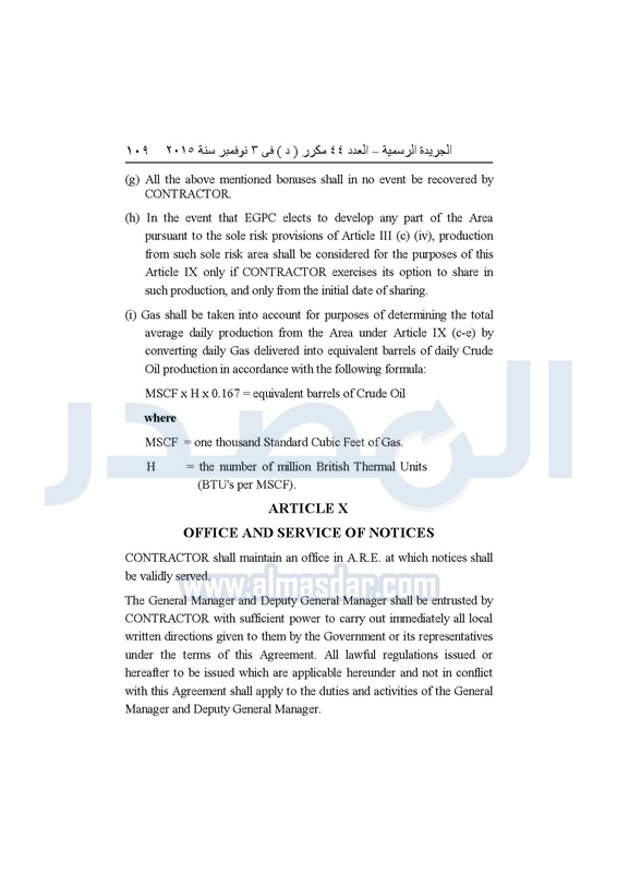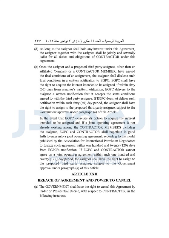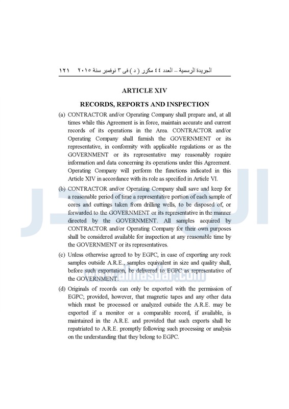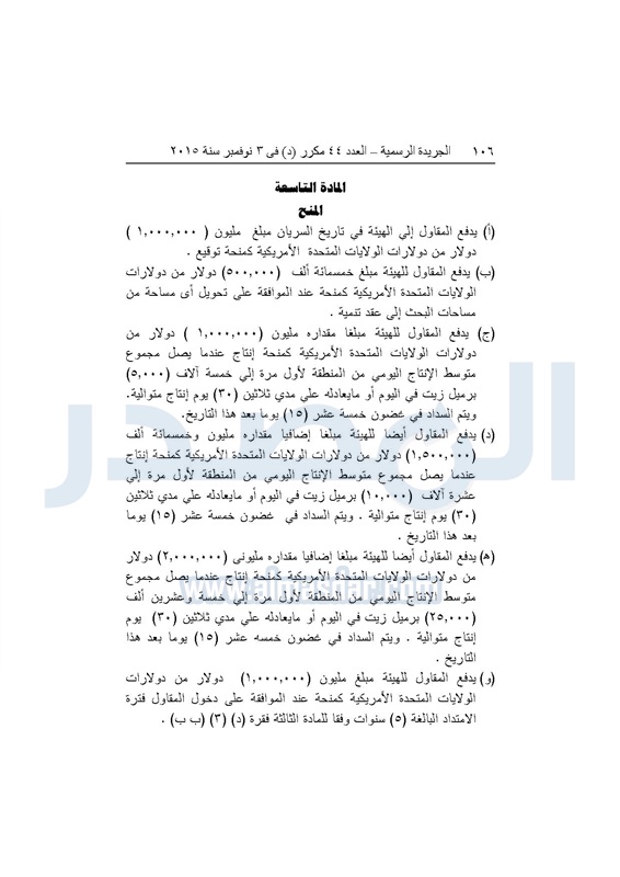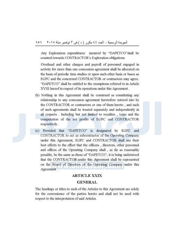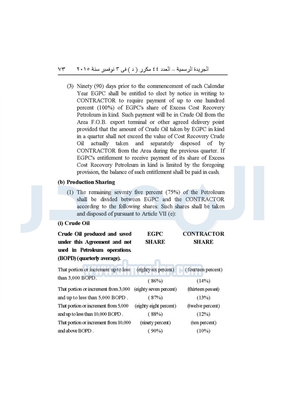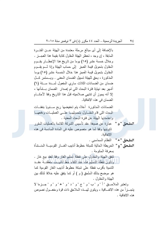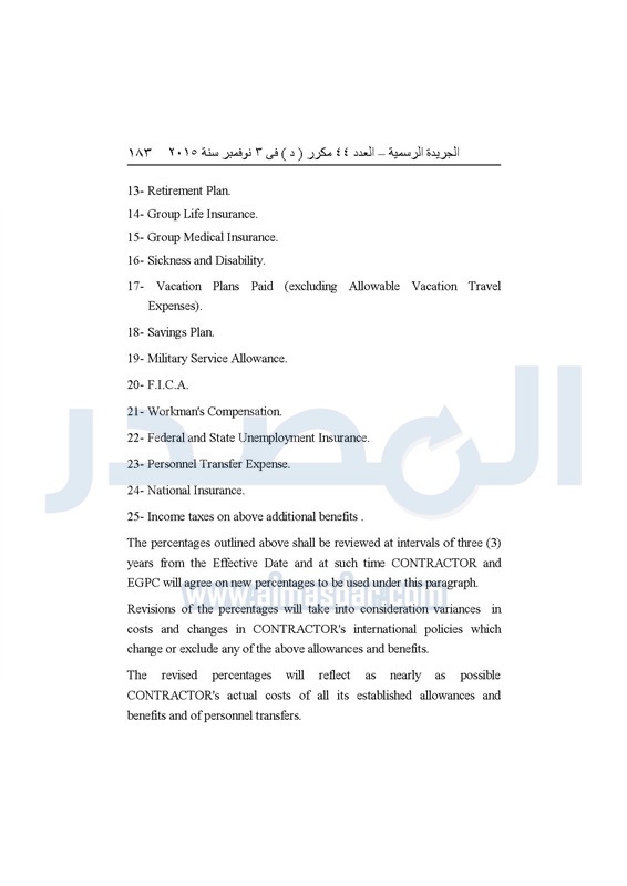 نشرت الجريدة الرسمية، في العدد رقم 44 مكرر "د"، الصادر في 3 نوفمبر 2015، قرار رئيس الجمهورية، رقم 108 لسنة 2015، بشأن الترخيص لوزير البترول في التعاقد مع الهيئة المصرية العامة للبترول، وشركة اتش بى اس إنترناشيونال إيجيبت ليمتد "HBS"، للبحث عن البترول واستغلاله في منطقة حليف، بالصحراء الغربية.