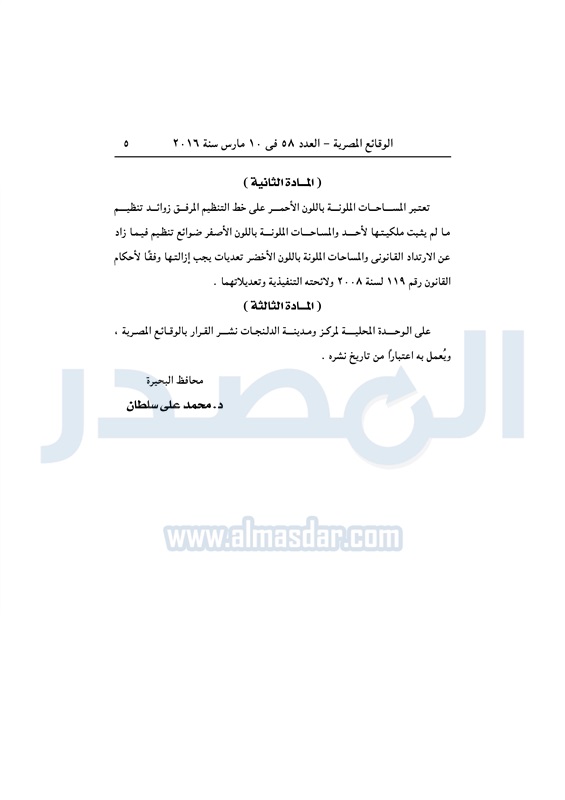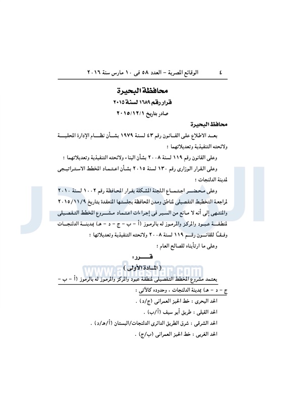 محافظات "البحيرة" تعتمد المخطط التفصيلي لمدينة الدلنجات الخميس 10 مارس 2016 - 10:24 ص 3/10/2016 10:24:22 AM محافظة البحيرة ـ صورة أرشيفية المصدر - خاص طباعة شارك نشرت الوقائع المصرية في العدد رقم 58، الصادر في10 مارس 2016، قرار محافظة البحيرة رقم 1689 لسنة 2015، بشأن اعتماد المخطط التفصيلي لمنطقة عبود والمركز بمدينة الدلنجات.لقراءة القرار: طباعة شارك محافظة البحيرة الوقائع المصرية الدلنجات البحيرة تابع المصدر علي جوجل نيوز تطبيق نبض