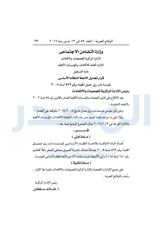 محافظات "وزارة التضامن" تعدل لائحة النظام الأساسى لمؤسسة "باب رزق" الأحد 13 مارس 2016 - 10:18 ص 3/13/2016 10:18:00 AM وزارة التضامن الإجتماعى ـ صورة أرشيفية المصدر - خاص طباعة شارك نشرت الوقائع المصرية في العدد رقم 59، الصادر في 12 مارس 2016، قرار وزارة التضامن الاجتماعي، بشأن تعديل لائحة النظام الأساسى لمؤسسة باب رزق جميل.لقراءة القرار: طباعة شارك وزارة التضامن الاجتماعى وزارة التضامن باب رزق الوقائع المصرية تابع المصدر علي جوجل نيوز تطبيق نبض