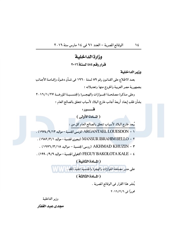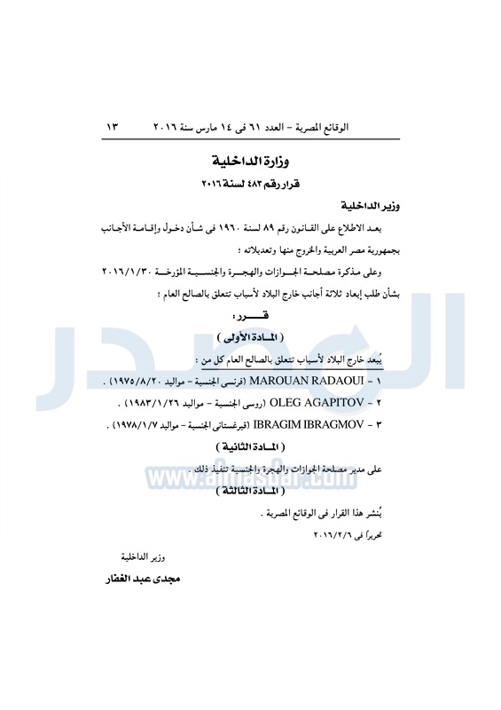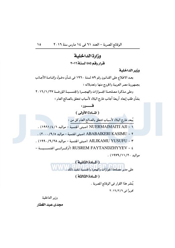 أخبار مصر وزير الداخلية يقرر إبعاد 3 أجانب خارج البلاد لدواع أمنية الإثنين 14 مارس 2016 - 10:13 ص 3/14/2016 10:13:04 AM وزارة الداخلية - صورة أرشيفية المصدر - خاص طباعة شارك نشرت الوقائع المصرية في العدد رقم 61 تابع الصادر في 14 مارس 2016، قرارات وزارة الداخلية بشأن إبعاد عدد من الأجانب خارج البلاد، لأسبابٍ تتعلّق بالصالح العام.لقراءة القرارات: طباعة شارك وزارة الداخلية مصر دواع امنية الوقائع المصرية المصريه الصالح العام الداخلية الاجانب تابع المصدر علي جوجل نيوز تطبيق نبض