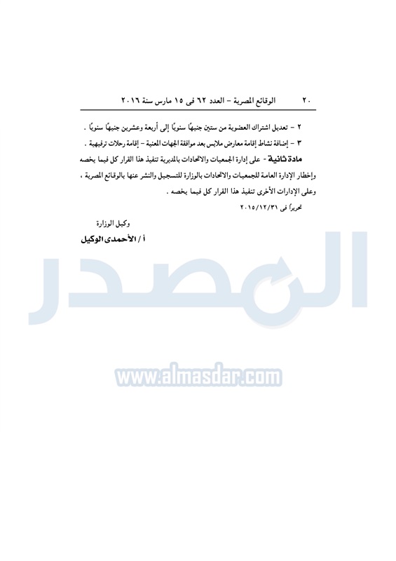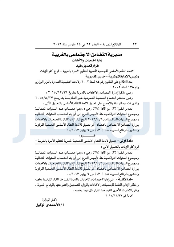نشرت الوقائع المصرية في العدد رقم 62، الصادر في 15 مارس 2016، قرارات مديرية التضامن الاجتماعى بالغربية، بشأن تعديل قيد لائحة النظام الأساسى لكلًا من الجمعية الوطنية للخدمات التعليمية والمجتمعية، وجمعية فرسان الخير، وجمعية الوفاق الوطنى لحقوق الإنسان، والجمعية المصرية لتنظيم الأسرة، وجمعية المعاصرة للمناهج وتكنولوجيا التعليم.