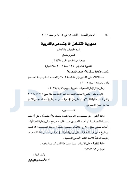 كما قررت المديرية حل جمعية رب الحرمين الخيرية بالمحلة حلًا اختياريًا .