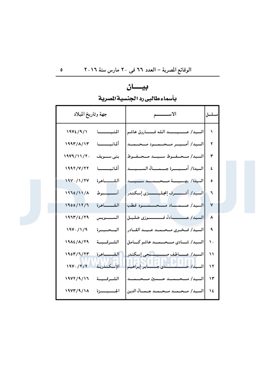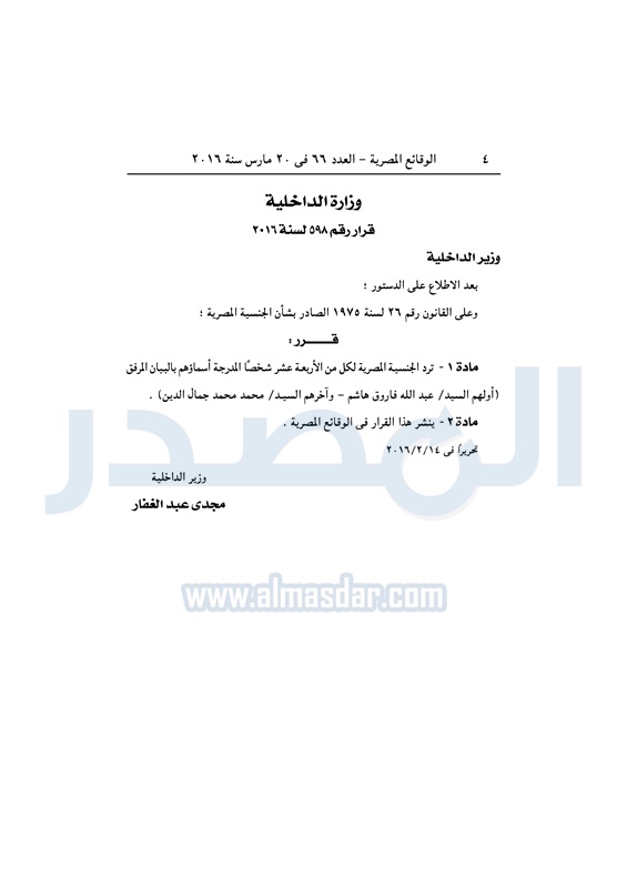 أخبار مصر وزير الداخلية يردّ الجنسية المصرية لـ 14 شخصا الأحد 20 مارس 2016 - 12:30 م 3/20/2016 12:30:00 PM مجدي عبد الغفار وزير الداخلية المصدر - خاص طباعة شارك نشرت الوقائع المصرية في العدد رقم 66، الصادر في 20 مارس 2016، قرار وزارة الداخلية رقم 598 لسنة 2016، بشأن ردّ الجنسية المصرية لـ14 شخصًا.لقراءة القرار: طباعة شارك وزير الداخلية وزارة الداخلية قرار الوقائع المصرية الجنسية المصرية تابع المصدر علي جوجل نيوز تطبيق نبض