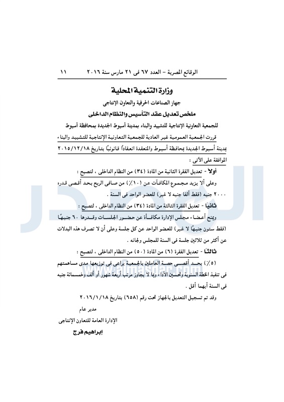 محافظات تعديل النظام الداخلي لجمعية "التشييد والبناء" بأسيوط الإثنين 21 مارس 2016 - 10:37 ص 3/21/2016 10:37:00 AM محافظة أسيوط ـ صور أرشيفية المصدر - خاص طباعة شارك نشرت الوقائع المصرية في العدد رقم 67، الصادر في 21 مارس 2016، ملخص تعديل عقد التأسيس والنظام الداخلى، للجمعية التعاونية الإنتاجية للتشيد والبناء بأسيوط .لقراءة القرار: طباعة شارك محافظة اسيوط الوقائع المصرية النظام الداخلي الجمعية التعاونية أسيوط تابع المصدر علي جوجل نيوز تطبيق نبض