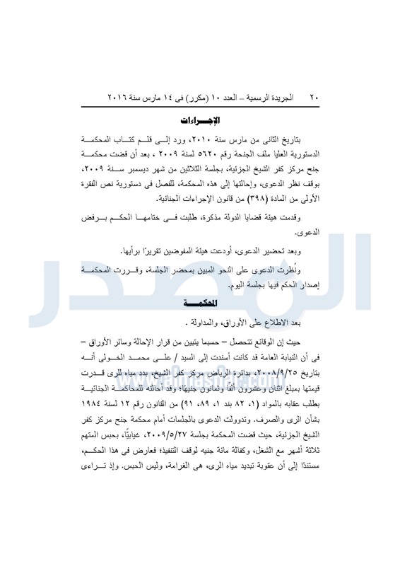 نشرت الجريدة الرسمية فى العدد 10 " مكرر" الصادر في 14 مارس لسنة 2016، حكم المحكمة الدستورية العليا في القضية رقم 56 لسنة 32 قضائية دستورية، في دعوى المقامة من النيابة، للفصل في دستورية نص الفقرة الأولى من المادة 398 من قانون الإجراءات الجنائية، بعدم دستورية المادة.