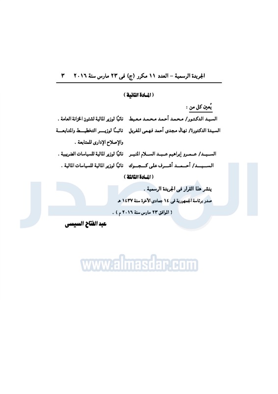 أخبار مصر "الجريدة الرسمية" تنشر قرار "السيسي" بتعيين الوزراء الجدد الخميس 24 مارس 2016 - 03:20 م 3/24/2016 3:20:00 PM عبد الفتاح السيسى رئيس الجمهورية المصدر - خاص طباعة شارك نشرت الجريدة الرسمية في العدد 11 مكرر "ج" الصادر في 23 مارس 2016، قرار رئيس الجمهورية، رقم 127 لسنة 2016، بشأن تعيين الوزراء الجدد.لقراءة القرار: طباعة شارك قرار جمهورى رئيس الجمهورية تعديل وزاري الوزراء الجدد السيسى الجريدة الرسمية تابع المصدر علي جوجل نيوز تطبيق نبض