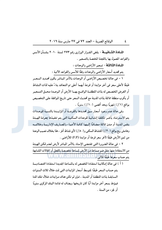 نشرت الوقائع المصرية في العدد رقم 72، الصادر في 27 مارس 2016، قرار وزارة الإسكان والمرافق والمجتمعات العمرانية، رقم 102 لسنة 2016، بشان إلزام لجنة التسعير بتطبيق القواعد والأسس الواردة بالقرار، عند مباشرتها وتحديد أسعار الأراضى والوحدات، ومقابل الإنتفاع السنوى.