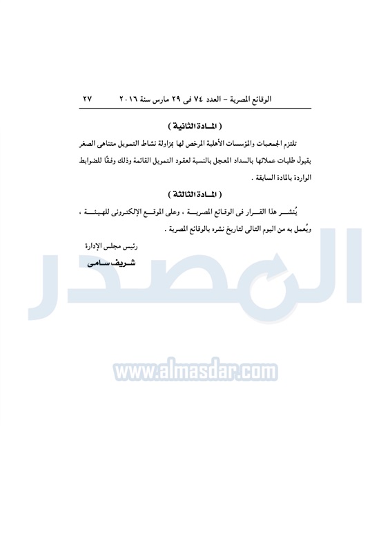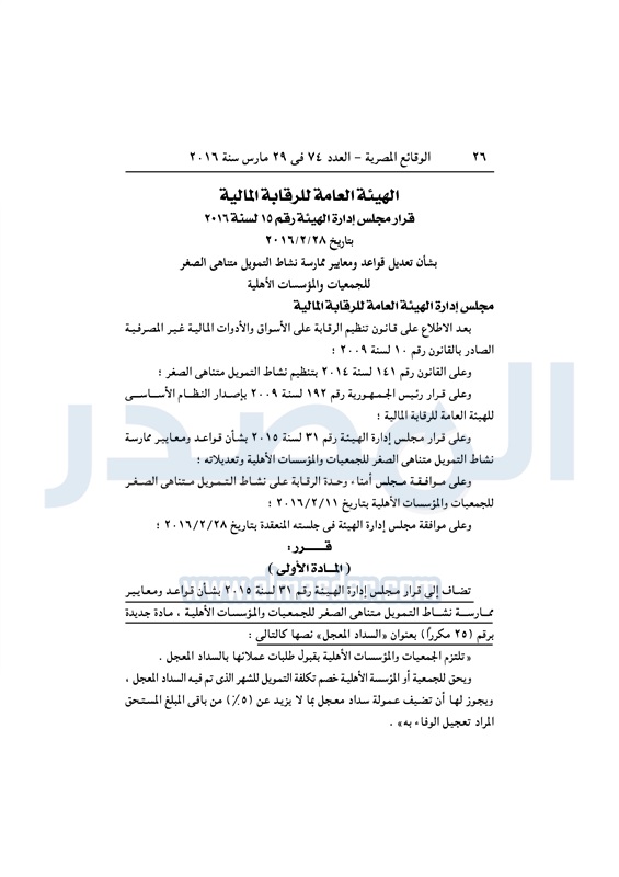 نشرت الوقائع المصرية، في العدد رقم 74، الصادر في 29 مارس 2016، قرار الهيئة العامة للرقابة المالية، رقم 15 لسنة 2016، بشأن تعديل قواعد ومعايير ممارسة نشاط التمويل متناهى الصغر للجمعيات والمؤسسات الأهلية .