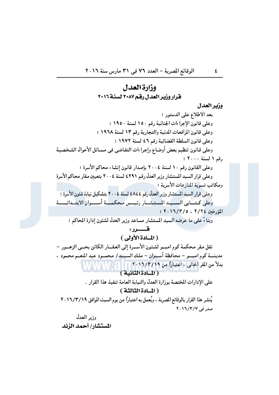 نشرت الوقائع المصرية، في العدد رقم 76، الصادر في 31 مارس 2016، قرارات وزارة العدل رقم 2086، و2087 لسنة 2016، بشأن نقل مقر انعقاد جلسات الدائرة 28 جنوب القاهرة "جنايات أول مدينة نصر" إلى معهد أمناء الشرطة بطرة، ونقل مقر محكمة كوم إمبو لشؤون الأسرة إلى العقار الكائن بحي الزهور بمدينة كوم إمبو في محافظة أسوان بدلًا من المقر الحالي.