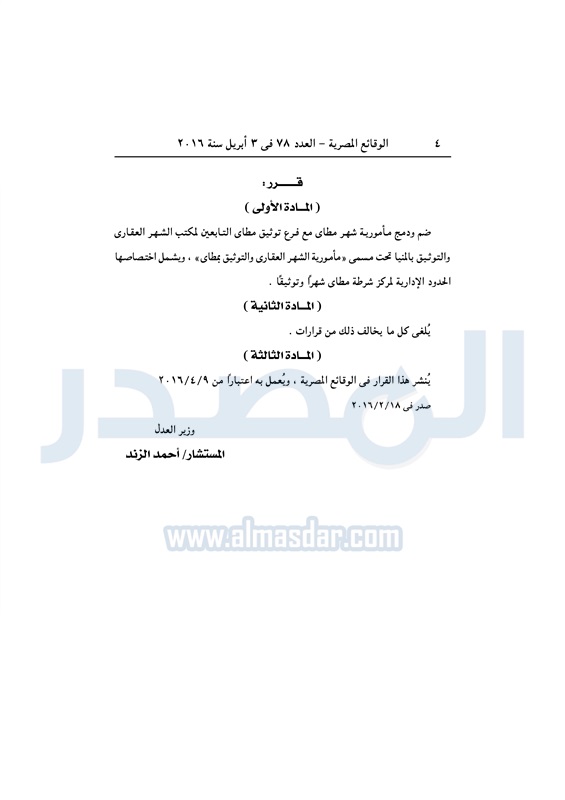 نشرت الوقائع المصرية في العدد رقم 78، الصادر في 3 أبريل 2016، قرار وزارة العدل، رقم 2334 لسنة 2016، بشأن ضم ودمج مأمورية شهر مطاي، مع فرع توثيق نطاى التابعين لمكتب الشهر العقارى والتوثيق بالمنيا تحت مسمى "مأمورية الشهر العقارى والتوثيق بمطاى".