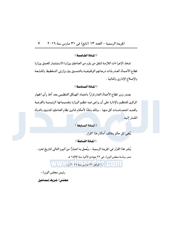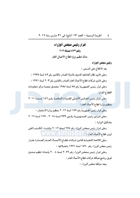 أخبار مصر "الوقائع" تنشر قرار الحكومة بالسماح لوزارة "قطاع الأعمال" بإدارة استثمارات الدولة الإثنين 04 أبريل 2016 - 03:26 م 4/4/2016 3:26:00 PM شريف اسماعيل رئيس الوزراء المصدر - خاص طباعة شارك نشرت الجريدة الرسمية في العدد 13 تابع الصادر في 31 مارس 2016، قرار رئيس الوزراء، رقم 873 لسنة 2016، بشأن تنظيم وزراة قطاع الأعمال العام .لقراءة القرار: طباعة شارك قطاع الأعمال الحكومة استثمارات الدولة تابع المصدر علي جوجل نيوز تطبيق نبض