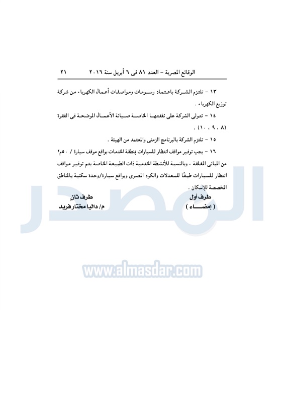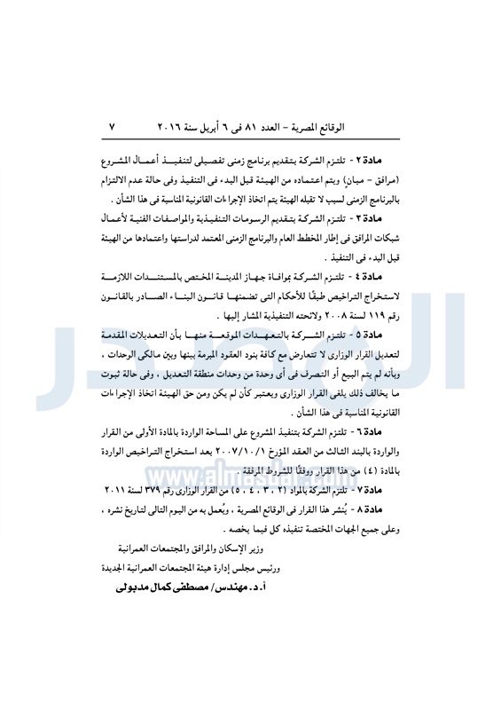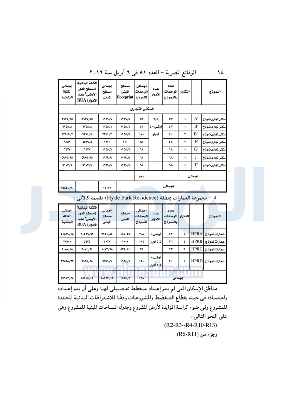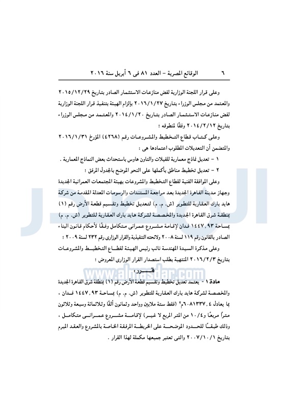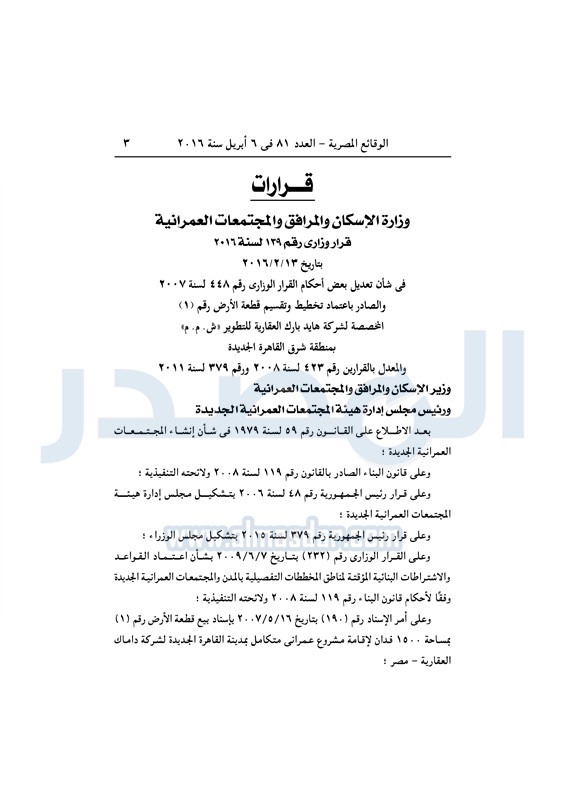 نشرت الوقائع المصرية في العدد رقم 81، الصادر في 6 لإبريل 2016، قرار وزارة الإسكان والمرافق والمجتمعات العمرانية، رقم 139 لسنة 2016، بشأن تعديل بعض أحكام القرار الوزاري الصادر باعتماد تخطيط وتنظيم قطعة الأرض المخصصة لشركة هايد بارك العقارية للتطوير في القاهرة الجديدة.
