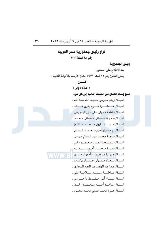 نشرت الجريدة الرسمية فى العدد رقم 14 الصادر فى 7 أبريل 2016، قرار رئيس الجمهورية رقم 98 لسنة 2016، بشأن منح الأوسمة والأنواط المدنية، للأمهات المثاليات .