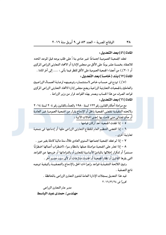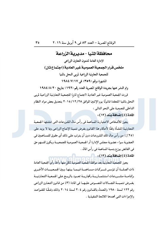 محافظات "زراعة" المنيا تصدر قرار عمومية "مربي النحل" الأحد 10 أبريل 2016 - 02:57 م 4/10/2016 2:57:00 PM محافظة المنيا - صورة أرشيفية المصدر - خاص طباعة شارك نشرت الوقائع المصرية في العدد رقم 83، الصادر في 9 أبريل 2016،ملخص قرار الجمعية العمومية غير العادية "اجتماع ثانٍ"، للجمعية التعاونية الزراعية لمربي النحل بالمنيا.لقراءة القرار: طباعة شارك مربي النحل مديرية الزراعة الوقائع المصرية المنيا الزراعة الجمعية العمومية الجمعية التعاونية تابع المصدر علي جوجل نيوز تطبيق نبض