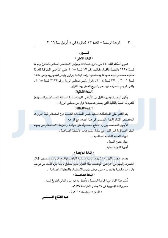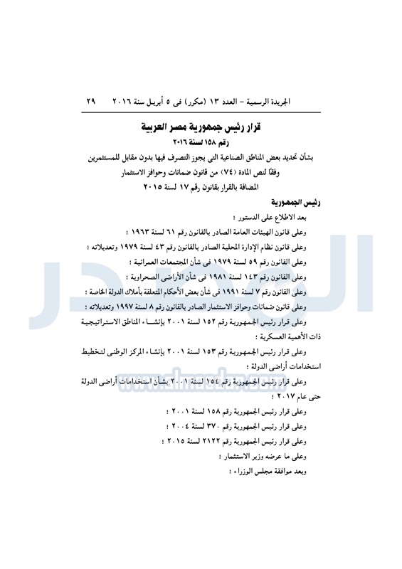 نشرت الجريدة الرسمية فى العدد رقم 13 مكرر الصادر فى 5 أبريل 2016، قرار رئيس الجمهورية، رقم 158 لسنة 2016، بشأن تحديد بعض المناطق الصناعية التى يجوز التصرف فيها بدون مقابل للمستثمرين وفقا لنص المادة 74 من قانون ضمانات وحوافز الإستثمار المضافة بالقرار بقانون 17 لسنة 2015.