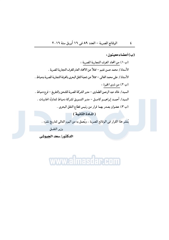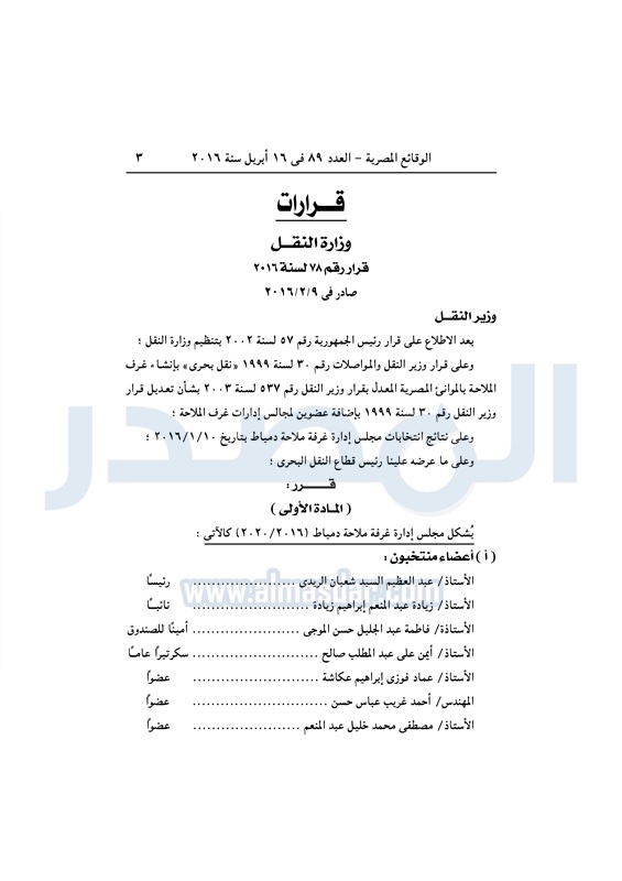 سيارات و نقل وزارة النقل تقرر تشكيل مجلس إدارة غرفة ملاحة دمياط الأحد 17 أبريل 2016 - 10:20 ص 4/17/2016 10:20:00 AM سعد الجيوشي وزير النقل السابق المصدر - خاص طباعة شارك نشرت الوقائع المصرية في العدد رقم 89، الصادر في 16 أبريل 2016، قرار وزارة النقل، رقم 78 لسنة 2016، بشأن تشكيل مجلس إدارة غرفة ملاحة دمياط.لقراءة القرار: طباعة شارك وزارة النقل دمياط الوقائع المصرية الوقائع النقل الملاحة 6 ابريل تابع المصدر علي جوجل نيوز تطبيق نبض