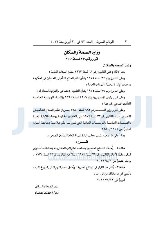 نشرت الوقائع المصرية في العدد رقم 93، الصادر في 20 أبريل 2016، قرار وزارة الصحة والسكان، رقم 229 لسنة 2016، بشأن تعديل انتفاع العاملين بمصلحة الضرائب العقارية، في محافظة أسوان، ليكون وفقًا لأحكام القانون، رقم 79 لسنة 1975، بدلًا من القانون رقم 32 لسنة 1975، وذلك اعتبارًا من 1 / 4 / 2016.