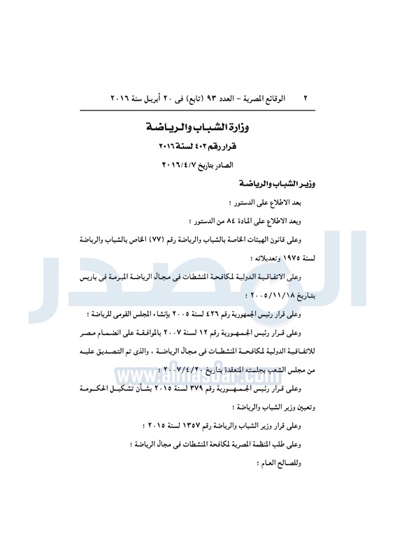 وذلك بعد الإطلاع على قانون الهيئات الخاصة بالشباب والرياضة رقم 77 الخاص بالشباب والرياضة ، وعلى الإتفاقيات الدولية لمكافحة المنشتطات فى مجال الرياضة، وعلى قرار إنضمام مصر للإتفاقية الدولية لمكافحة المنشطات فى مجال الرياضة.
