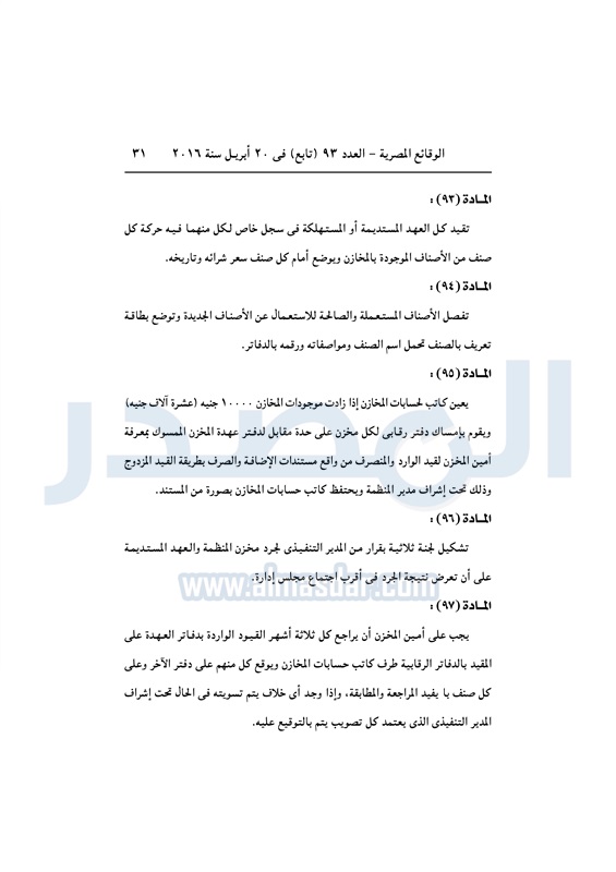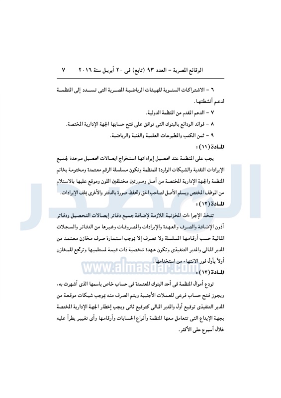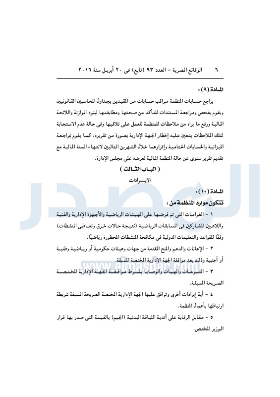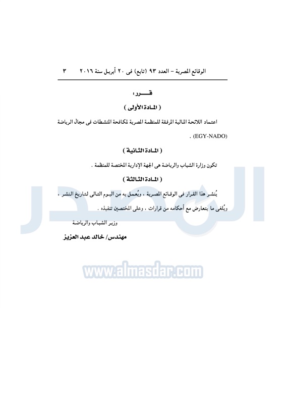 نشرت الوقائع المصرية في العدد رقم 93 "تابع"، الصادر في 20 أبريل 2016 قرار وزارة الشباب والرياضة، رقم 403 لسنة 2016، الصادر بتاريخ 2016/4/7، بشأن إعتماد اللائحة المالية المرفقة للمنظمة المصرية لمكافحة المنشطات فى مجال الرياضة " EGY-NADO"، وتكون وزارة الشباب والرياضة هى الجهة الغدارية المختصة للمنظمة .