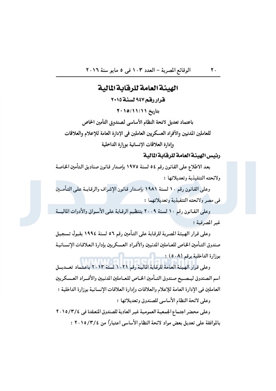 نشرت الوقائع المصرية في العدد رقم 103، الصادر في 5 مايو 2016، قرار الهيئة العامة للرقابة المالية رقم 947 لسنة 2016، بشأن اعتماد تعديل لائحة النظام الأساسي، لصندوق التأمين للعاملين المدنيين والأفراد العسكريين، العاملين في الإدارة العامة للإعلام والعلاقات وإدارة العلاقات الإنسانية بوزارة الداخلية.