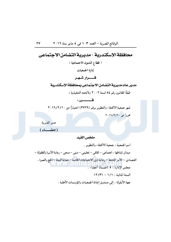 نشرت الوقائع المصرية في العدد رقم 103، الصادر في 5 مايو 2016، قرارات مديريات التضامن الاجتماعي في عدد من المحافظات، بشأن قيد بعض الجمعيات وتعديل بعض لوائح النظام الأساسي لها.