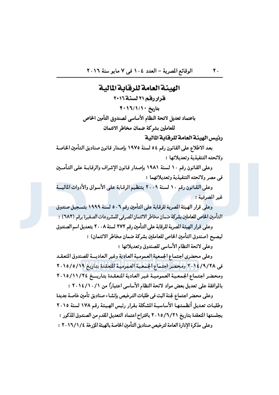 نشرت الوقائع المصرية في العدد رقم 104، الصادر في 7 مايو 2016، قرار الهيئة العامة للرقابة المالية، رقم 21 لسنة 2016، بشأن اعتماد تعديل لائحة النظام الأساسي لصندوق التأمين الخاص، للعاملين بشركة ضمان مخاطر الائتمان.