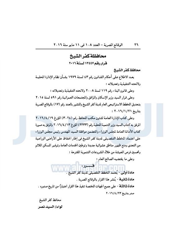 محافظات اعتماد المخطط التفصيلي لمدينة كفر الشيخ الأربعاء 11 مايو 2016 - 12:11 م 5/11/2016 12:11:00 PM محافظة كفر الشيخ ـ صورة أرشيفية المصدر - خاص طباعة شارك نشرت الوقائع المصرية، العدد رقم 108، الصادر في 11 مايو 2016، قرار محافظة كفر الشيخ، رقم 13447 لسنة 2016، بشأن اعتماد المخطط التفصيلي لمدينة كفر الشيخ.لقراءة القرار : طباعة شارك مصر محافظ كفر الشيخ الوقائع المصرية تابع المصدر علي جوجل نيوز تطبيق نبض