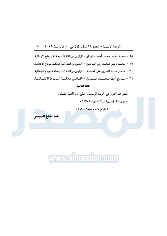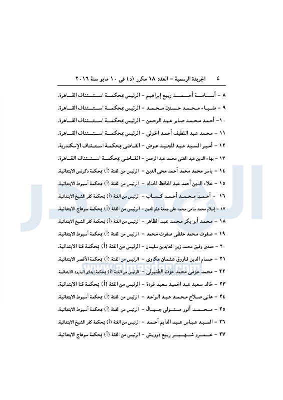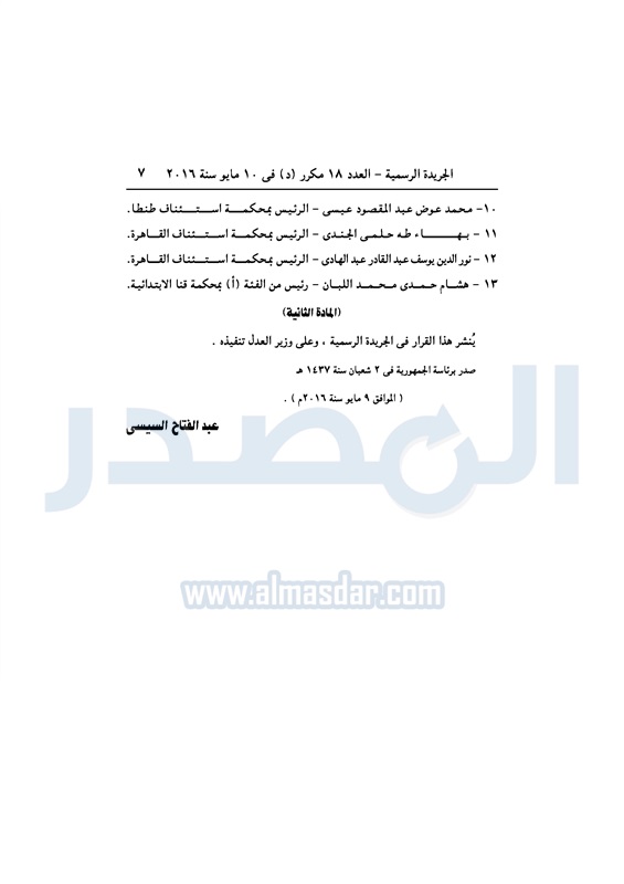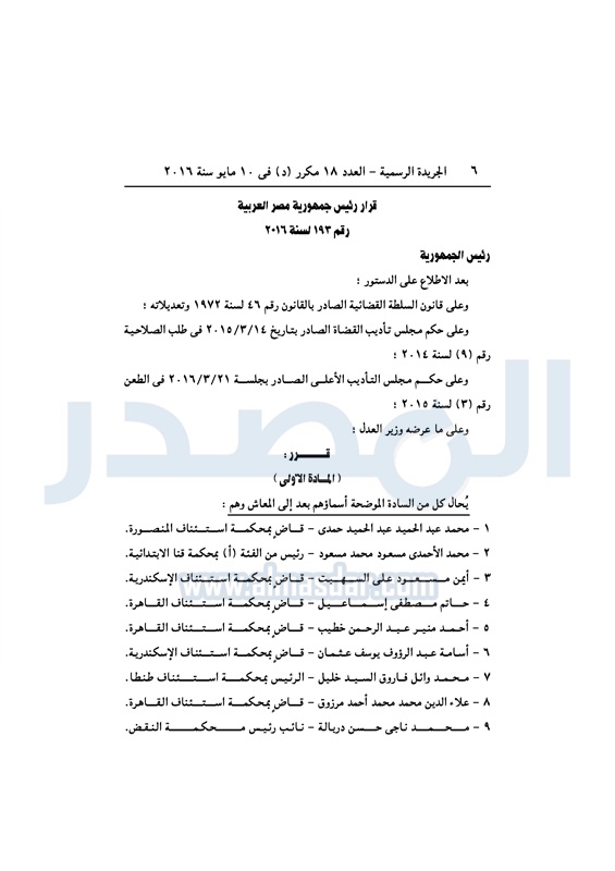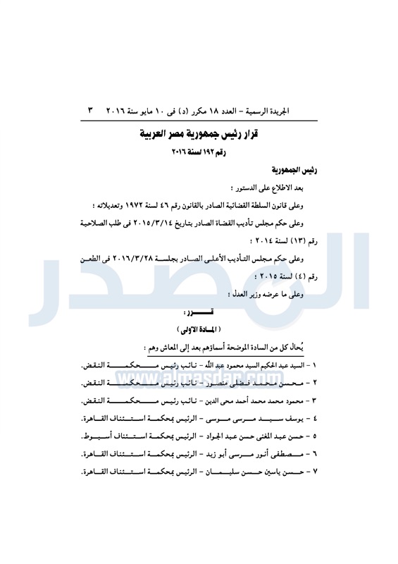أخبار مصر بالأسماء.. السيسي يحيل 44 قاضيًا إلى المعاش الأربعاء 11 مايو 2016 - 02:26 م 5/11/2016 2:26:00 PM عبد الفتاح السيسي رئيس الجمهورية المصدر - خاص طباعة شارك نشرت الجريدة الرسمية، في العدد رقم 18 مكرر "د"، الصادر في 10 مايو سنة 2016، قراري رئيس جمهورية مصر العربية، رقم 192، و193 لسنة 2016، بشأن إحالة 44 من القضاة إلى المعاش. لقراءة القرار: طباعة شارك قرار جمهورى المعاش القضاه السيسى الجريدة الرسمية تابع المصدر علي جوجل نيوز تطبيق نبض