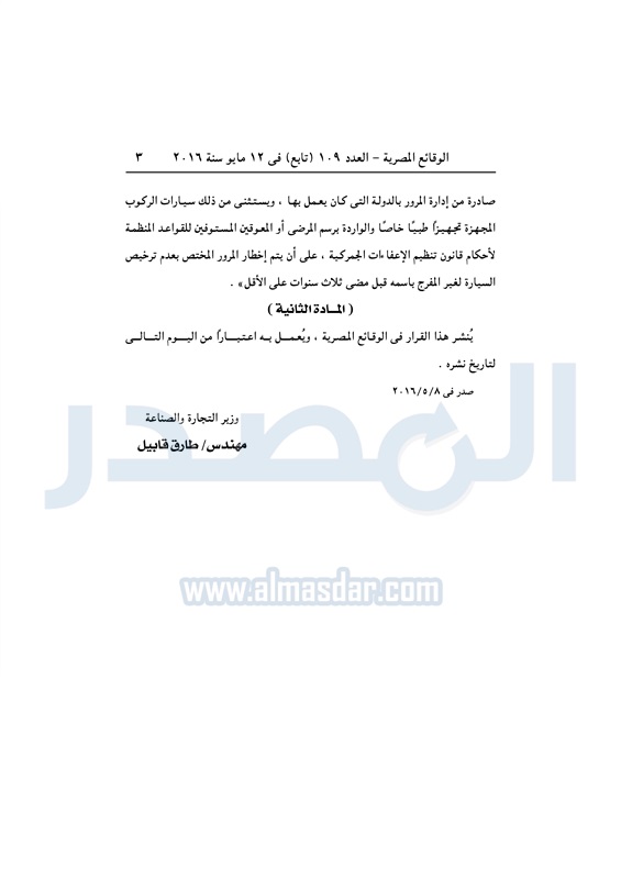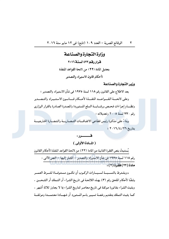 نشرت الوقائع المصرية في عددها رقم 109 "تابع" الصدور في 12 مايو 2016، قرار وزارة التجارة والصناعة، رقم 423 لسنة 2016، بشأن تعديل المادة 22 من لائحة القواعد المنفذة لأحكام قانون الاستيراد والتصدير.