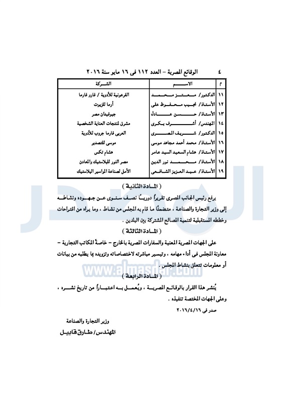 نشرت الوقائع المصرية فى العدد رقم 112 الصدر فى 16 مايو 2016، قرار وزراة التجارة والصناعة، رقم 342 لسنة 2016، بشأن تشكيل الجانب المصري في مجلس الأعمال المصرى - العراقي ، لمدة ثلاث سنوات.