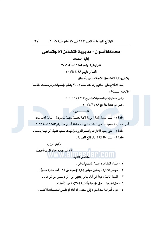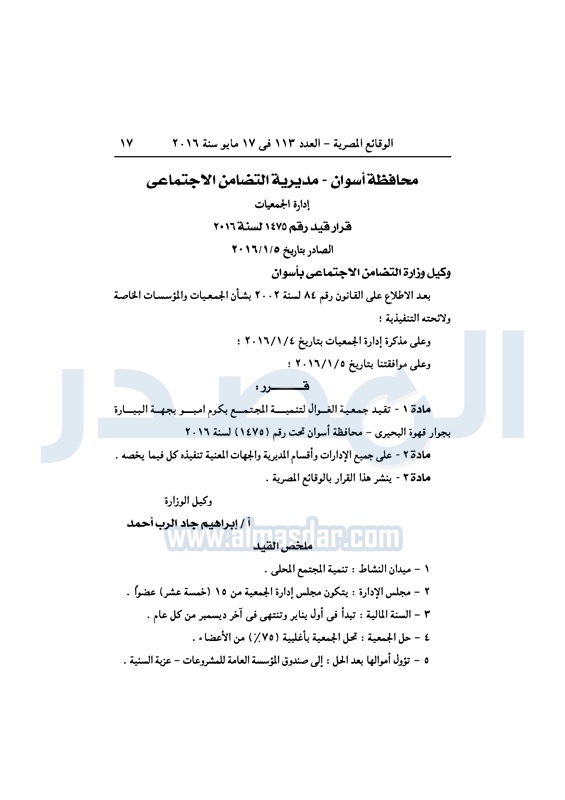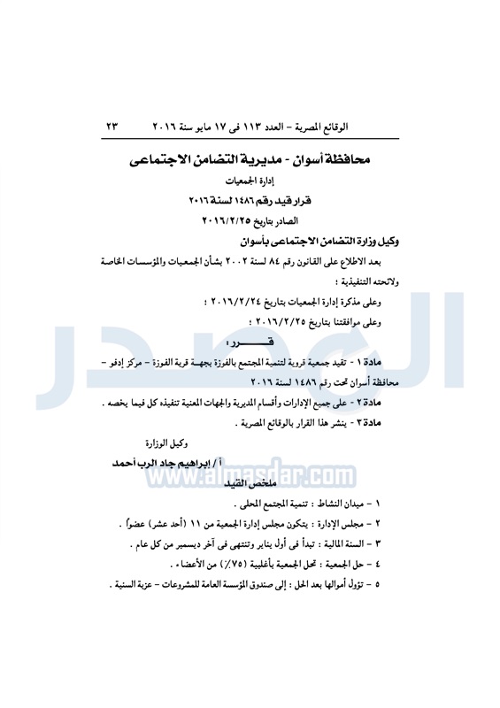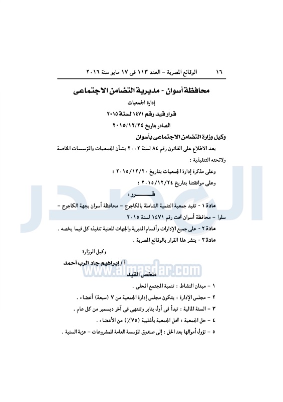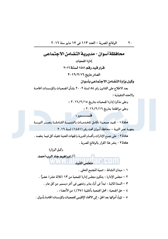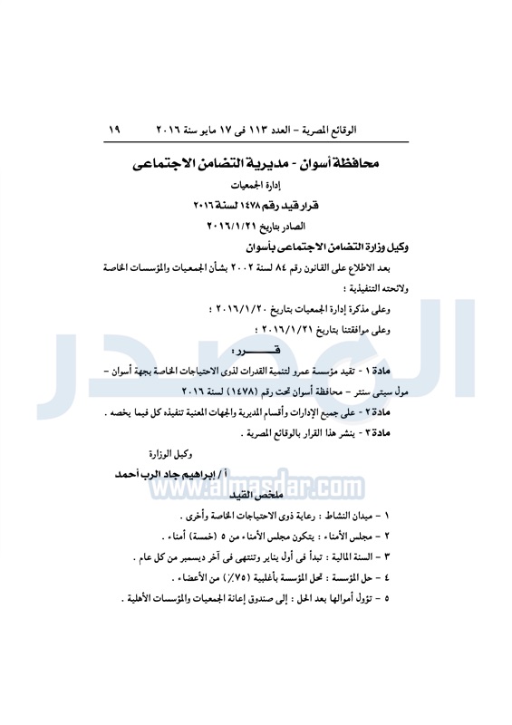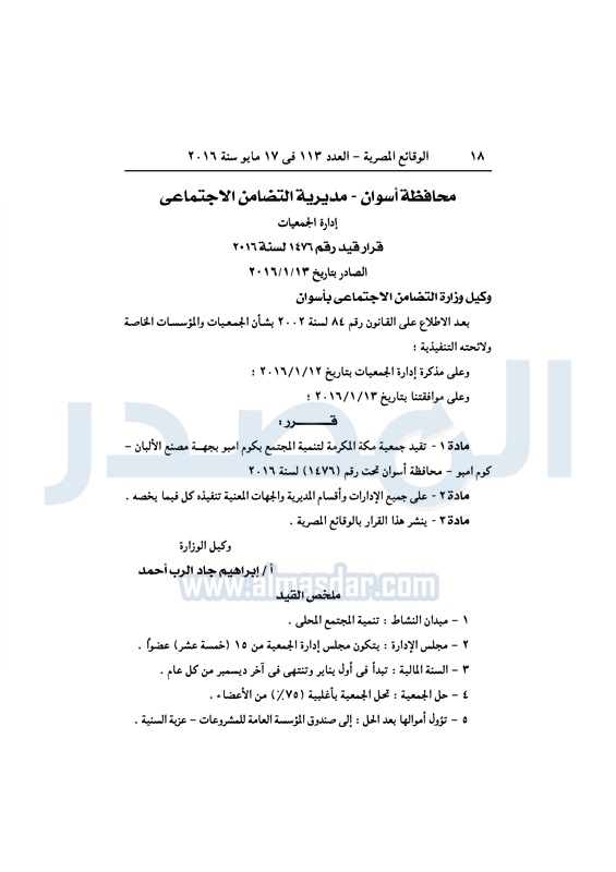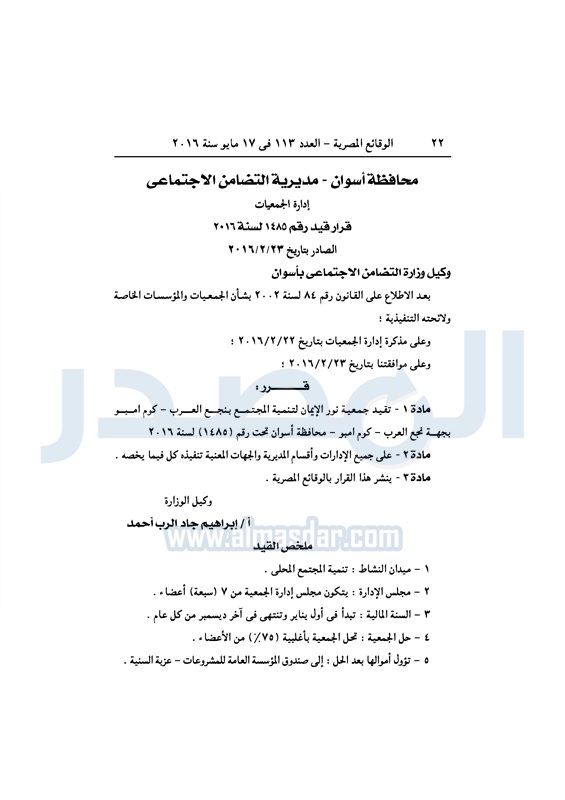 ثفافة وفنون "التضامن الاجتماعي" تقيد 8 جمعيات خاصة بأسوان الثلاثاء 17 مايو 2016 - 10:42 ص 5/17/2016 10:42:00 AM ديوان محافظة أسوان - صورة أرشيفية المصدر - خاص طباعة شارك نشرت الوقائع المصرية، في العدد رقم 113 الصادر في 17 مايو 2016، قرارات مديرية التضامن الاجتماعي، بمحافظة أسوان، بشأن قيد 8 جمعيات.لقراءة القرار: طباعة شارك محافظة اسوان جمعيات خيرية الوقائع المصرية التضامن الاجتماعي تابع المصدر علي جوجل نيوز تطبيق نبض