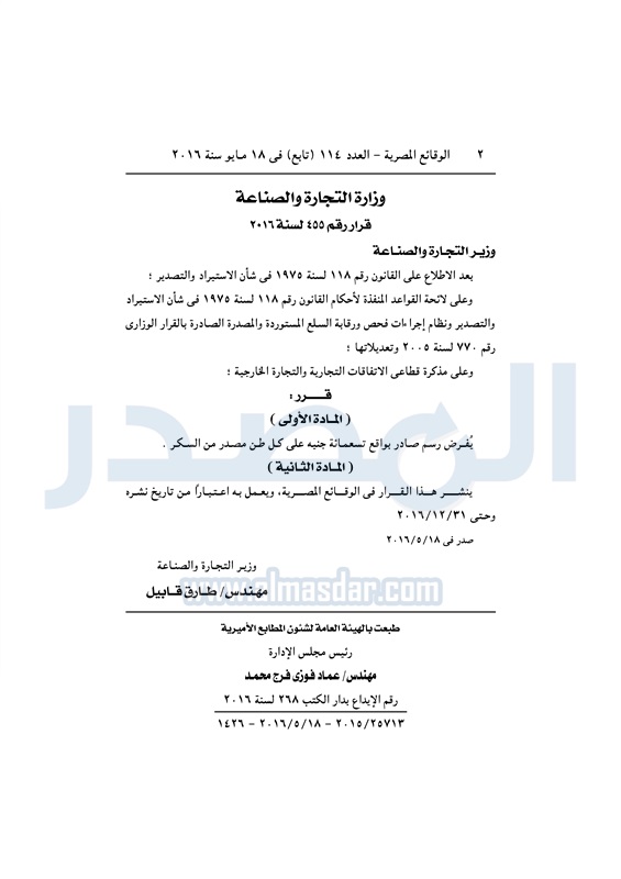 أسواق وزارة التجارة تفرض 900 جنيه رسم صارد على السكر الأربعاء 18 مايو 2016 - 03:42 م 5/18/2016 3:42:00 PM طارق قابيل وزير التجارة والصناعة المصدر - خاص طباعة شارك نشرت الوقائع المصرية، في العدد رقم 114 "تابع"، الصادر في 18 مايو 2016، قرار وزارة التجارة والصناعة، رقم 455 لسنة 2016، بشأن فرض رسم صادر بواقع 900 جنيه، على كل طن مصدر من السكر.لقراءة القرار: طباعة شارك وزير الصناعة والتجارة رسم صادر تصدير السكر الوقائع المصرية المصدر الصناعة والتجارة السكر تابع المصدر علي جوجل نيوز تطبيق نبض