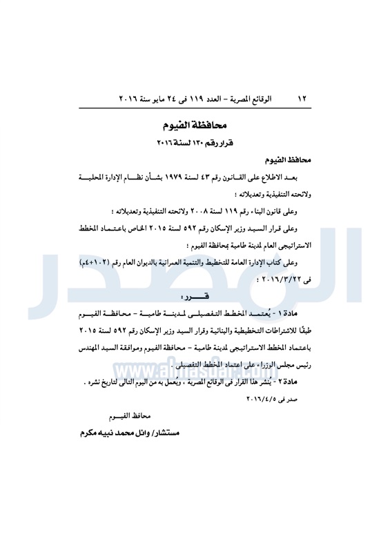نشرت الوقائع المصرية، في العدد رقم 119، الصادر في 24 مايو 2016، قرار محافظة الفيوم، رقم 130 لسنة 2016، بشأن اعتماد المخطط التفصيلي لمدينة طامية، بمحافظة الفيوم، طبقًا للاشتراطات التخطيطية والبنائية.