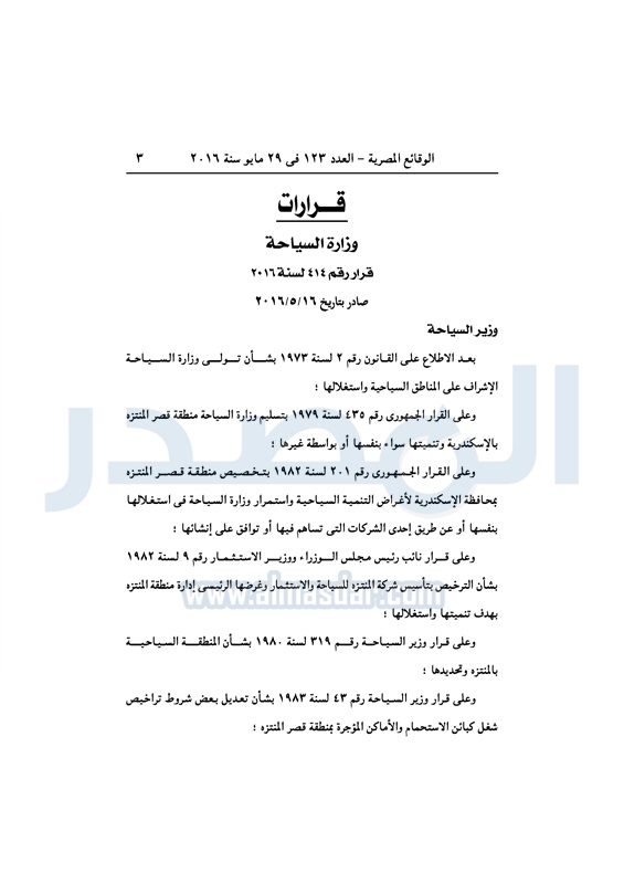 نشرت الوقائع المصرية، في العدد رقم 123، الصادر في 29 مايو 2016، قرار وزارة السياحة، رقم 414 لسنة 2016، بشأن إلغاء مادتين من قرار وزير السياحة، رقم 304 لسنة 2013، بقواعد استغلال كبائن قصر المنتزه، وذلك تنفيذًا لحكم محكمة القضاء الإداري.
