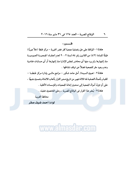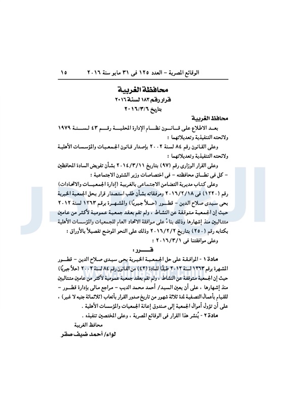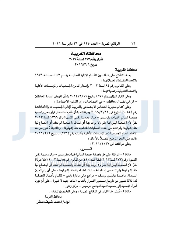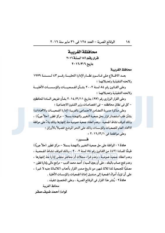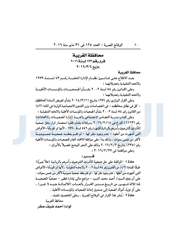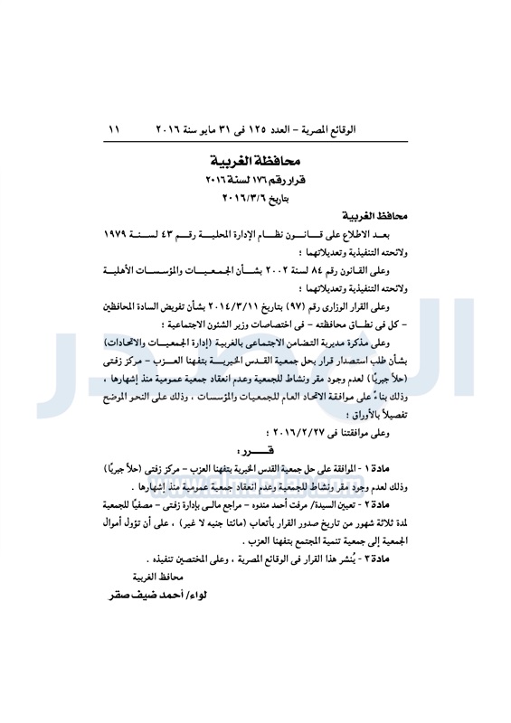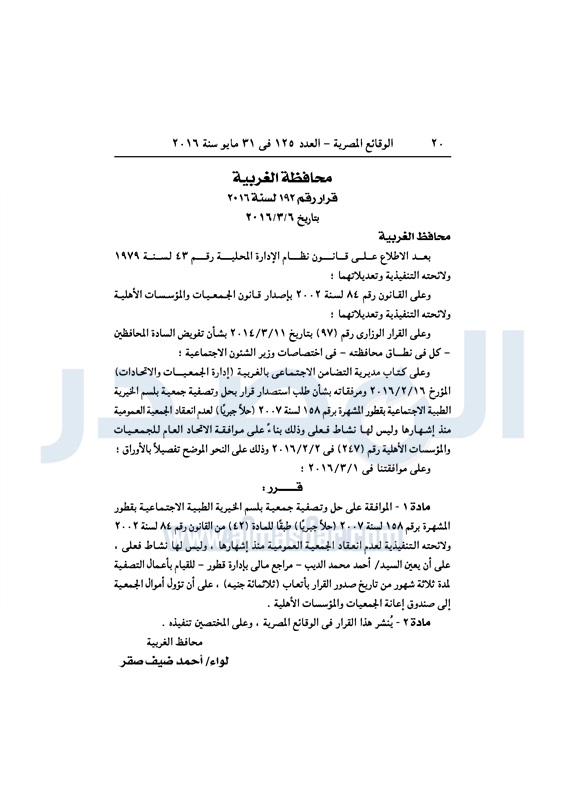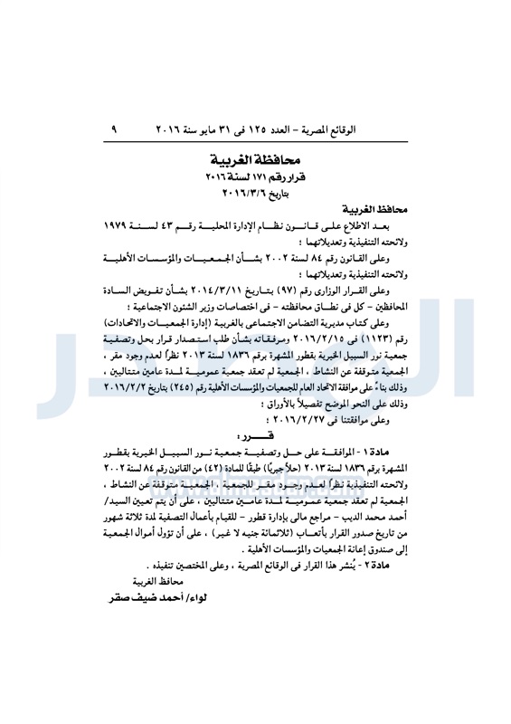 محافظات حل 11 جمعية خيرية "إجباريًا" بمحافظة الغربية الثلاثاء 31 مايو 2016 - 10:47 ص 5/31/2016 10:47:02 AM محافظة الغربية ـ صورة أرشيفية المصدر - خاص طباعة شارك نشرت الوقائع المصرية، في العدد رقم 125، لسنة 31 مايو 2016، قرارات محافظة الغربية، لسنة 2016، بشأن الموافقة على حل وتصفية 11 جمعية بالمحافظة، حلًا جبريًا.لقراءة القرار: طباعة شارك محافظة الغربية جمعية خيرية الوقائع المصرية تابع المصدر علي جوجل نيوز تطبيق نبض