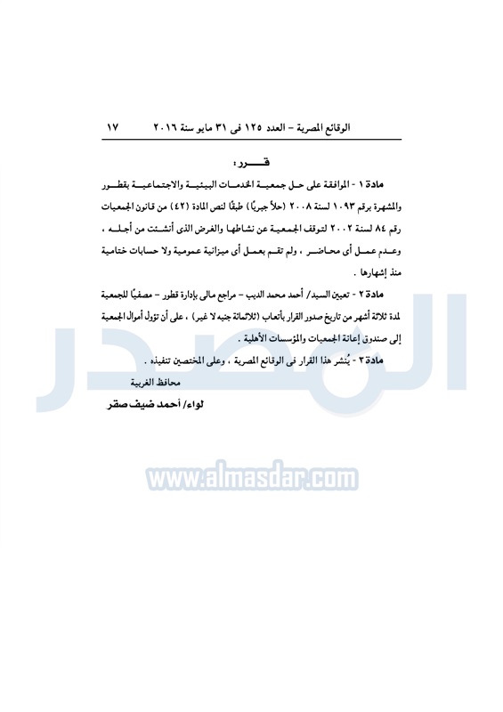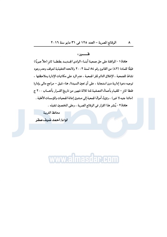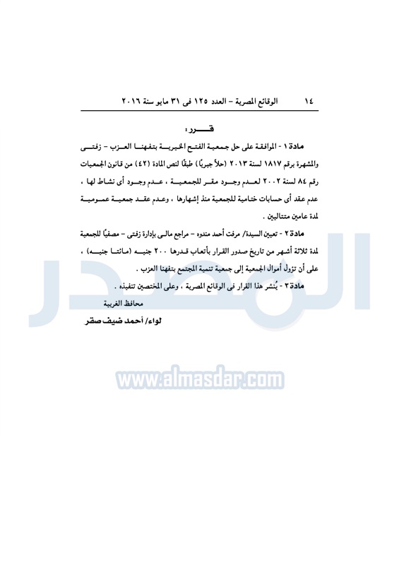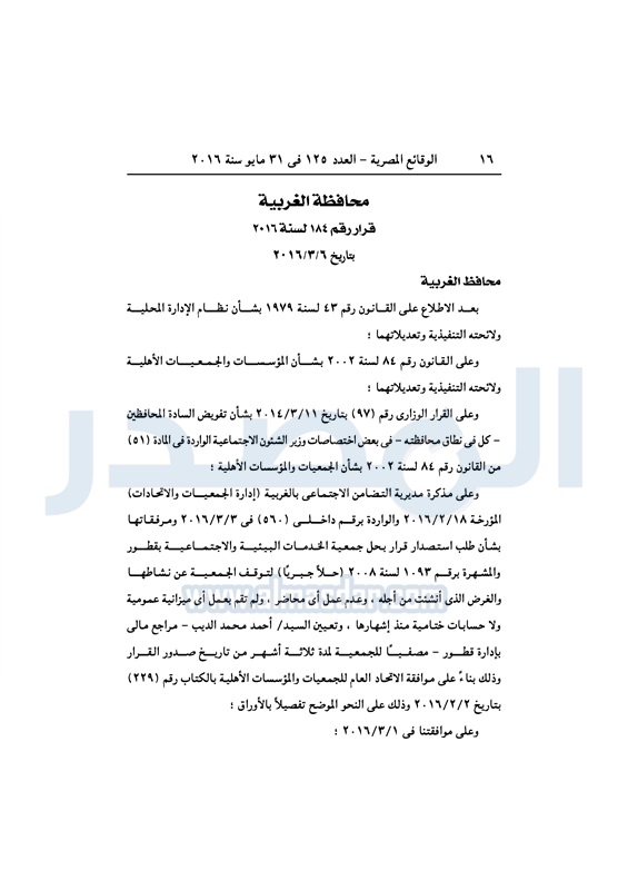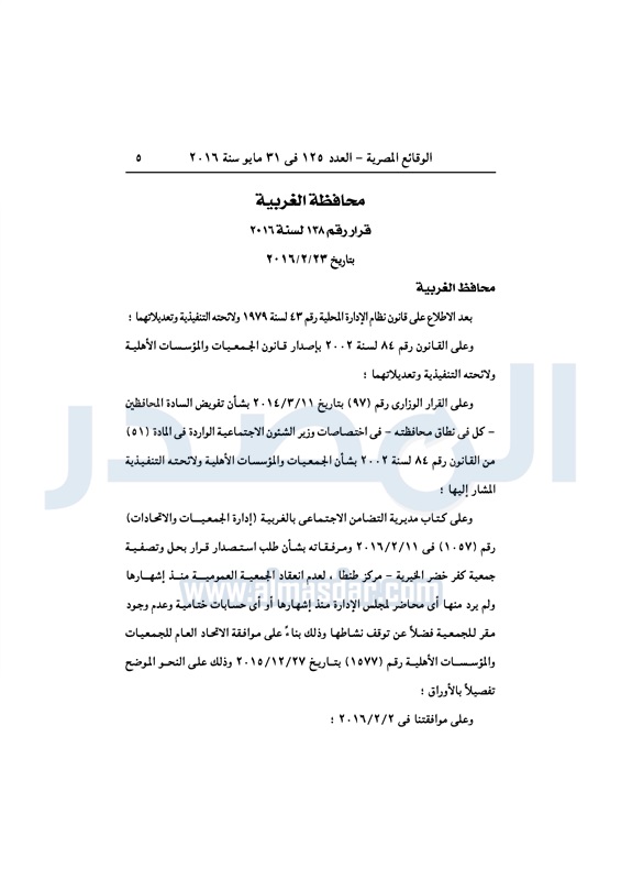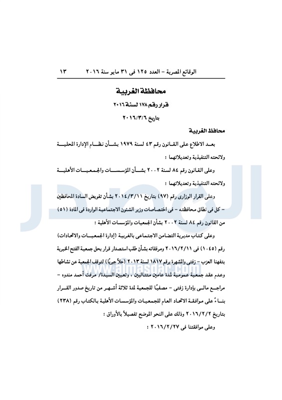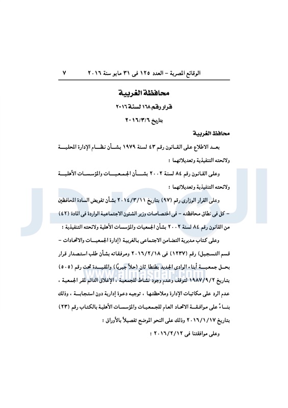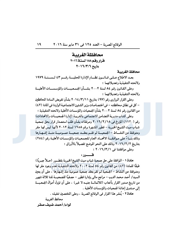 محافظات حل 11 جمعية خيرية "إجباريًا" بمحافظة الغربية الثلاثاء 31 مايو 2016 - 10:47 ص 5/31/2016 10:47:02 AM محافظة الغربية ـ صورة أرشيفية المصدر - خاص طباعة شارك نشرت الوقائع المصرية، في العدد رقم 125، لسنة 31 مايو 2016، قرارات محافظة الغربية، لسنة 2016، بشأن الموافقة على حل وتصفية 11 جمعية بالمحافظة، حلًا جبريًا.لقراءة القرار: طباعة شارك محافظة الغربية جمعية خيرية الوقائع المصرية تابع المصدر علي جوجل نيوز تطبيق نبض