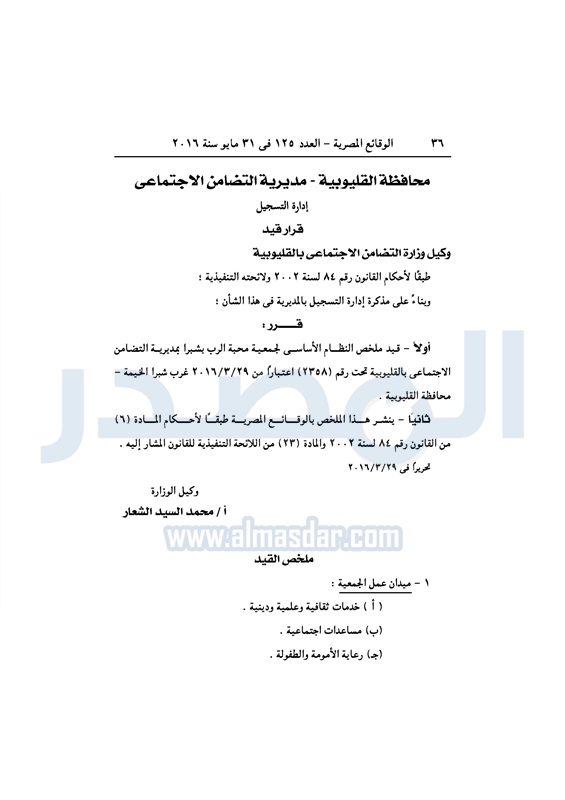 محافظات "التضامن" تقيد عددًا من الجمعيات بالمحافظات الثلاثاء 31 مايو 2016 - 11:50 ص 5/31/2016 11:50:00 AM التضامن الاجتماعى - صورة أرشيفية المصدر - خاص طباعة شارك نشرت الوقائع المصرية، في العدد رقم 125، الصادر في 31 مايو 2016، قرارات ومديريات التضامن في عدد من المحافظات، بشأن قيد بعض الجمعيات.لقراءة القرار: طباعة شارك وزارة التضامن مديريات التضامن جمعيات التضامن الاجتماعي تابع المصدر علي جوجل نيوز تطبيق نبض