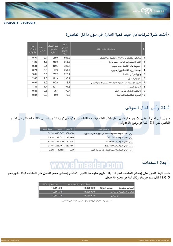 "المصدر" تنشر تقرير أداء البورصة المصرية خلال شهر مايو