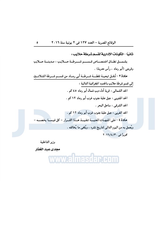 نشرت الوقائع المصرية، في العدد رقم 127، الصادر في 2 يونيو 2016، قرار وزير الداخلية، رقم 1936 لسنة 2016، بشأن تعديل الحدود الجغرافية، والمكونات الإدارية، لقسمي شرطة الشلاتين وحلايب، بمديرية أمن البحر الأحمر.