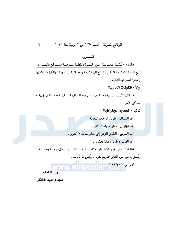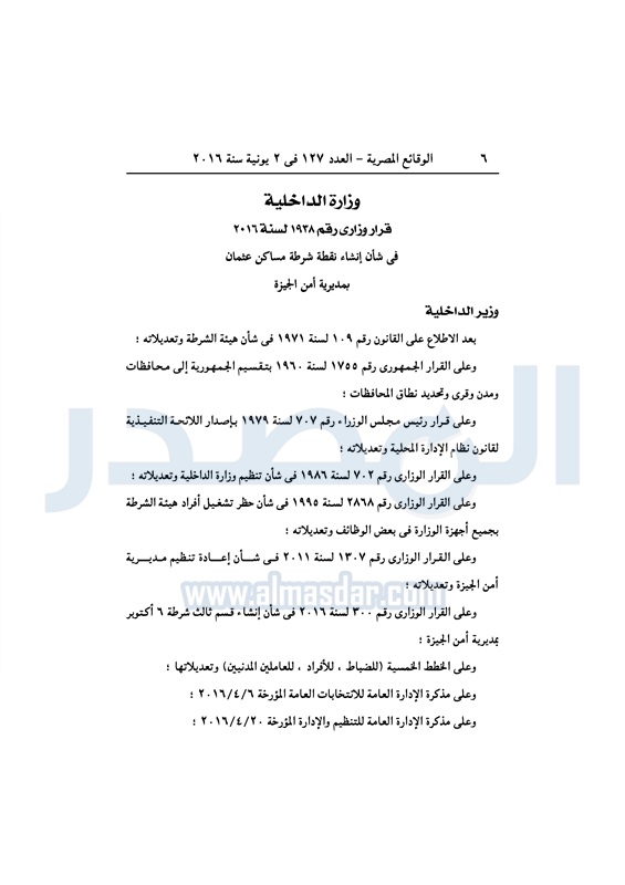 محافظات إنشاء نقطة شرطة مساكن عثمان في الجيزة الخميس 02 يونيو 2016 - 11:15 ص 6/2/2016 11:15:15 AM وزارة الداخلية - صورة أرشيفية المصدر - خاص طباعة شارك نشرت الوقائع المصرية، في العدد رقم 127، الصادر في 2 يونيو 2016، قرار وزير الداخلية، رقم 1938لسنة 2016، بشأن إنشاء نقطة شرطة مساكن عثمان، بمديرية أمن الجيزة.لقراءة القرار: طباعة شارك نقطة شرطة مساكن عثمان الوقائع المصرية الداخلية الجيزة تابع المصدر علي جوجل نيوز تطبيق نبض