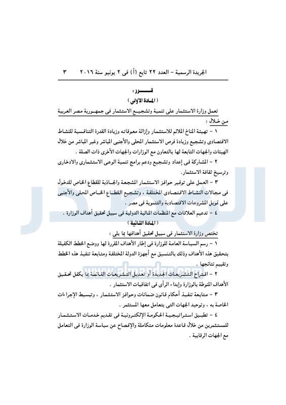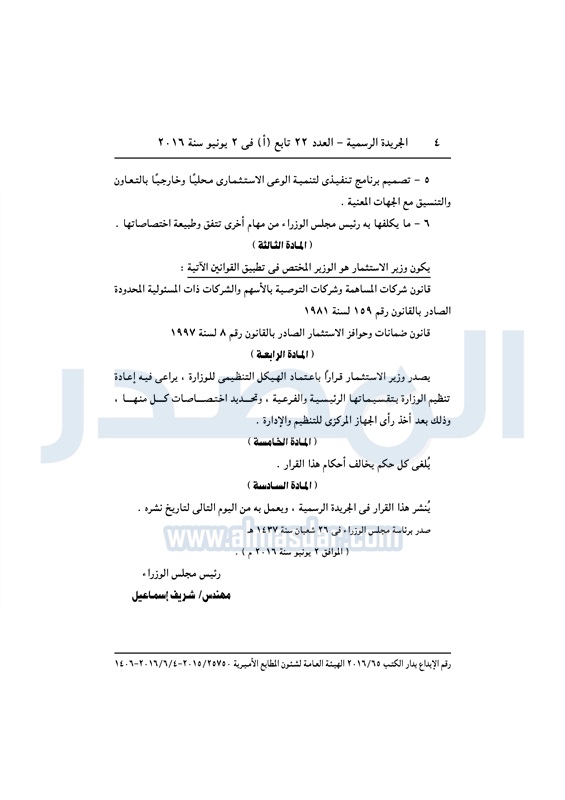 استثمار شريف إسماعيل يقرر إعادة تنظيم وزارة الاستثمار السبت 04 يونيو 2016 - 06:25 م 6/4/2016 6:25:00 PM شريف اسماعيل رئيس الوزراء المصدر - خاص طباعة شارك نشرت الجريدة الرسمية في العدد رقم 22 تابع "أ" الصادر في 2 يونيو لسنة 2016، قرار رئيس مجلس الوزراء، رقم 1486 لسنة 2016، بشأن إعادة تنظيم وزارة الاستثمار.لقراءة القرار: طباعة شارك وزاره الاستثمار مجلس الوزراء شريف اسماعيل الجريدة الرسمية تابع المصدر علي جوجل نيوز تطبيق نبض