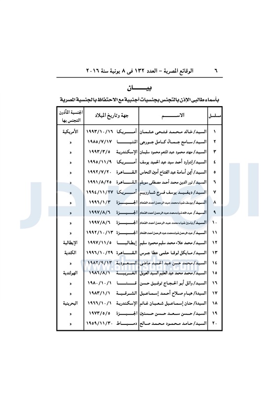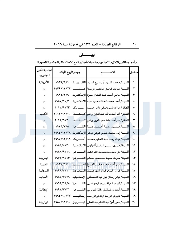 نشرت الوقائع المصرية، في العدد رقم 132، الصادر في 8 يونيو 2016، قرار وزارة الداخلية، رقم 1984، و1985، و1986، و1987، و1988 لسنة 2016، بشأن الإذن لـ 80 مواطن بالتجنس بجنسية أجنبية.